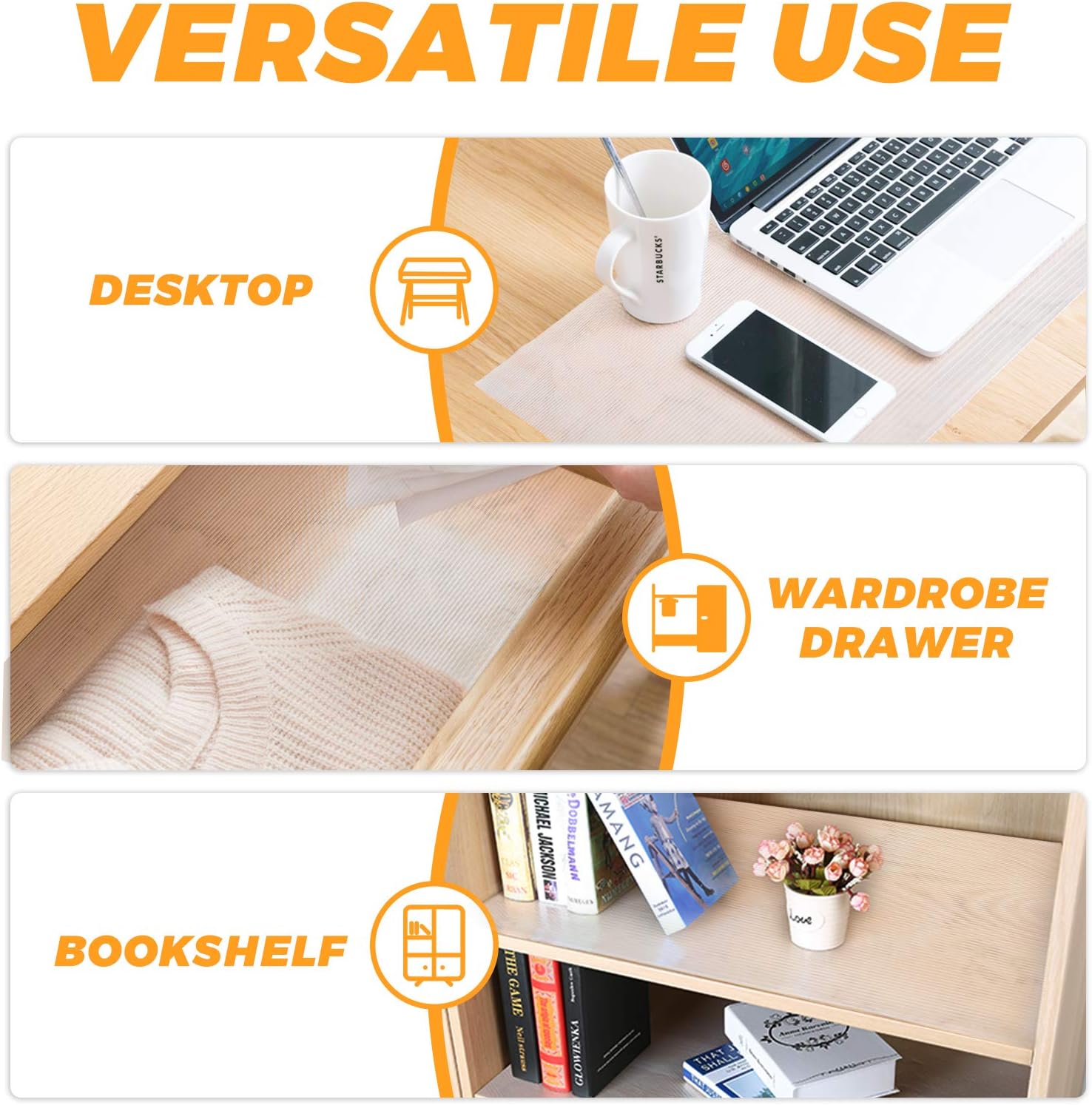 - 👍 PERFECT STORAGE SOLUTION- These shelf liner come in 12" x 20 ft. Made of EVA material and feature a non-slip design, the shelf liners for kitchen cabinets help prevent spillage by keeping your items locked into place and free from unwanted dirt and debris. The plastic drawer liners for dresser is ideal for use in a top drawer, bedroom dresser, bathroom cabinets, kitchen cabinets and desk drawers for organizing and protecting small items from damage or scratches.