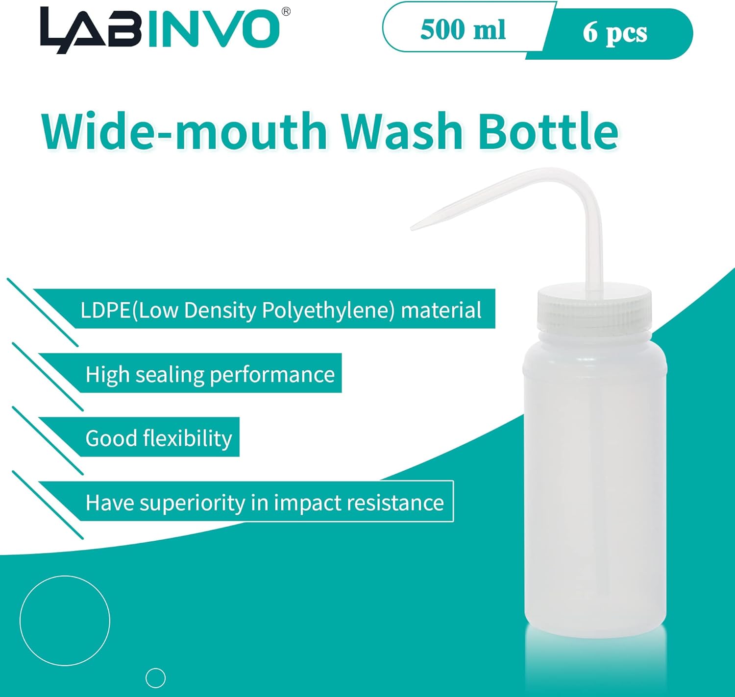 6pcs of Economy Wash Bottles, Vol.500ml (17oz), Wide-Mouth, Self-Venting Safety Wash Bottles, LDPE Material, IN-WBW500