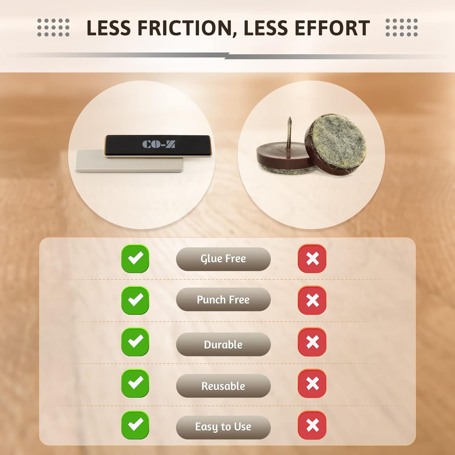 - 8-PIECE MOVING KIT: CO-Z's rectangular furniture slider kit supports up to 110 lb., helping you easily move large heavy furniture across your flooring; measuring 2.5x9 in., our pads work with most furniture legs, including chairs, beds, cabinets, & more