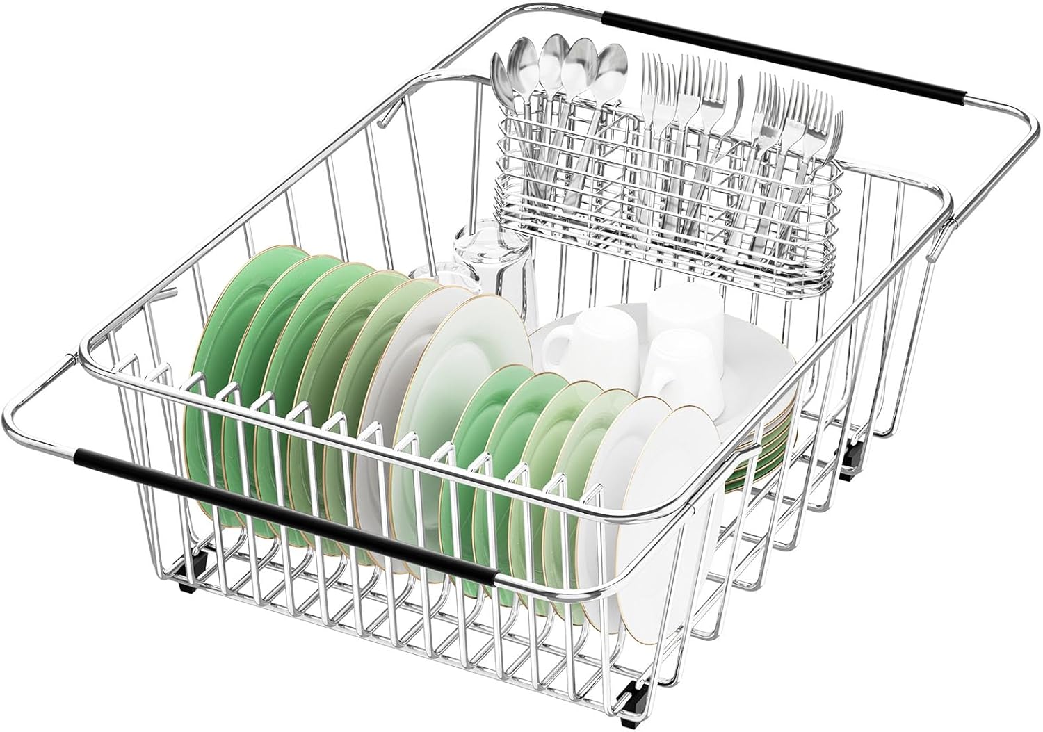 Large Sink Dish Drying Rack, Expandable 304 Stainless Steel Metal Dish Drainer Rack Organizer Shelves with Stainless Steel Utensil Holder Over Inside Sink, Rustproof