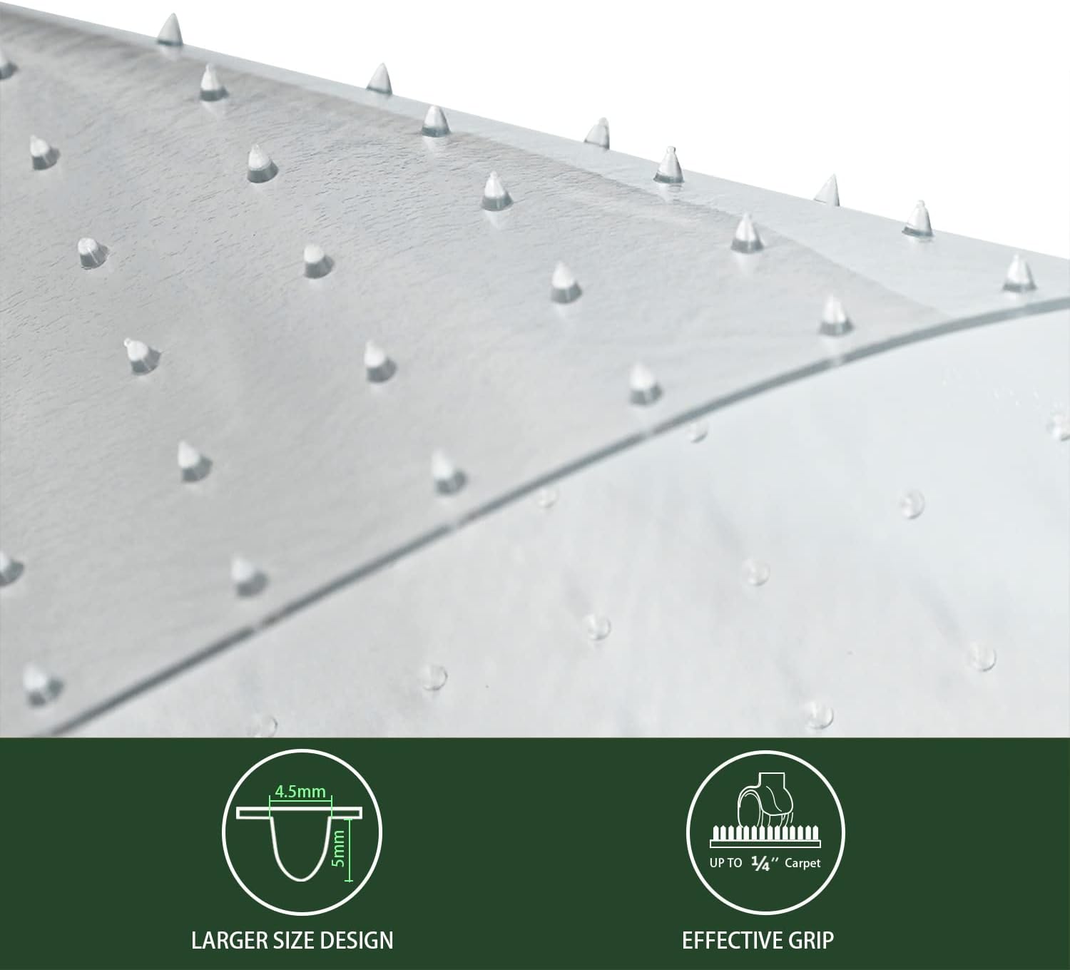 - UPGRADED MATERIAL: The clear office chair mat for carpet is made of upgraded material with a special grain on the front, that makes the chairs move more smoothly, The large nail on the back has a scientific structural design and density distribution, making the carpet chair mats more firmly fixed to the carpet.