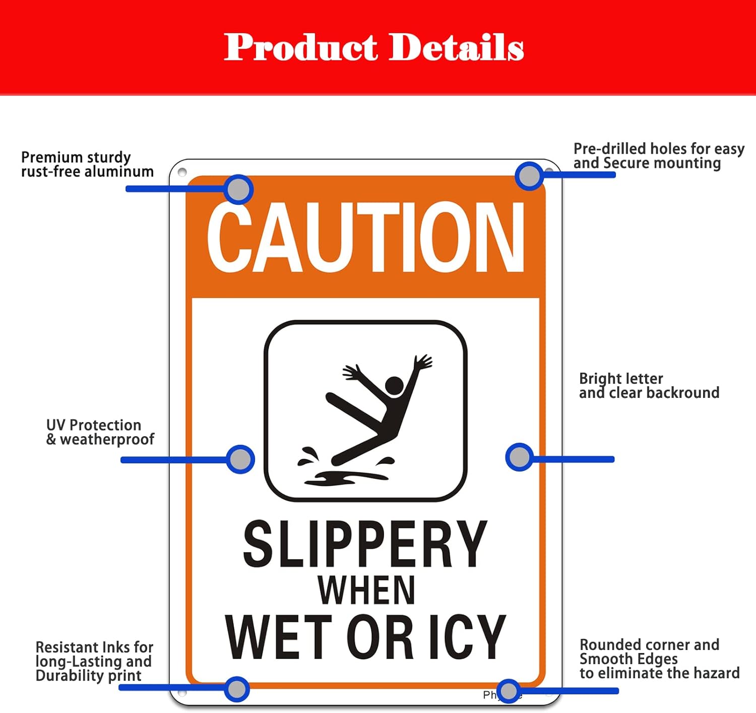 2 Pack Caution Slippery When Wet or Icy Sign, 7” x 10” Metal Rust Free Aluminum Sign, Weather Resistant, Waterproof, Durable Ink, Easy to Install