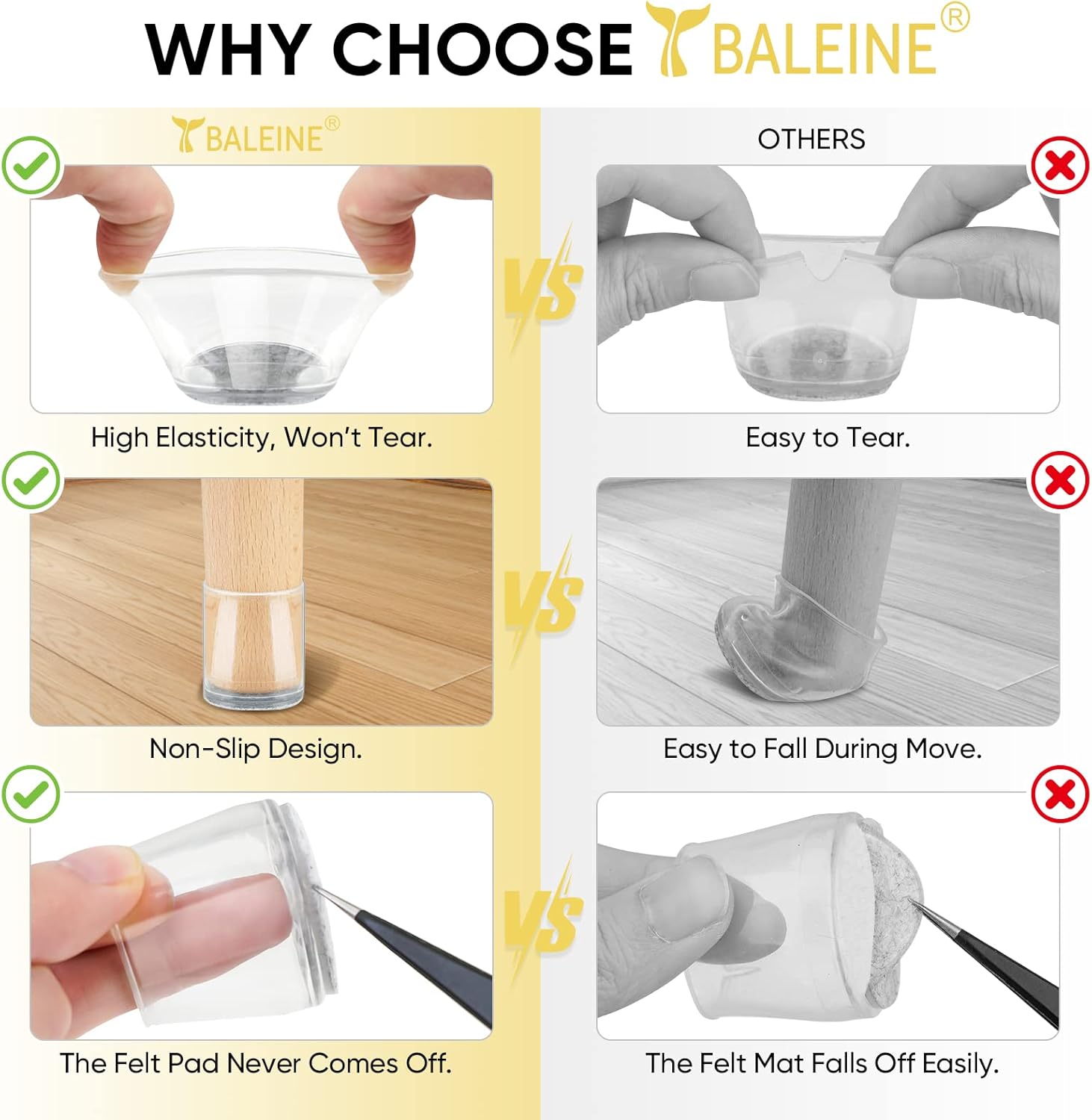 - [BALEINE DIFFERENCE] We'd like to offer top-tier quality products at the most reasonable price. So we chose the premium quality silicone material. It bonds the felt pad better, and won't tear easily when stretched or have any unpleasant odor. All caps are well-packed during shipping so you won't receive pressed chair leg covers which might shorten the life span of it.