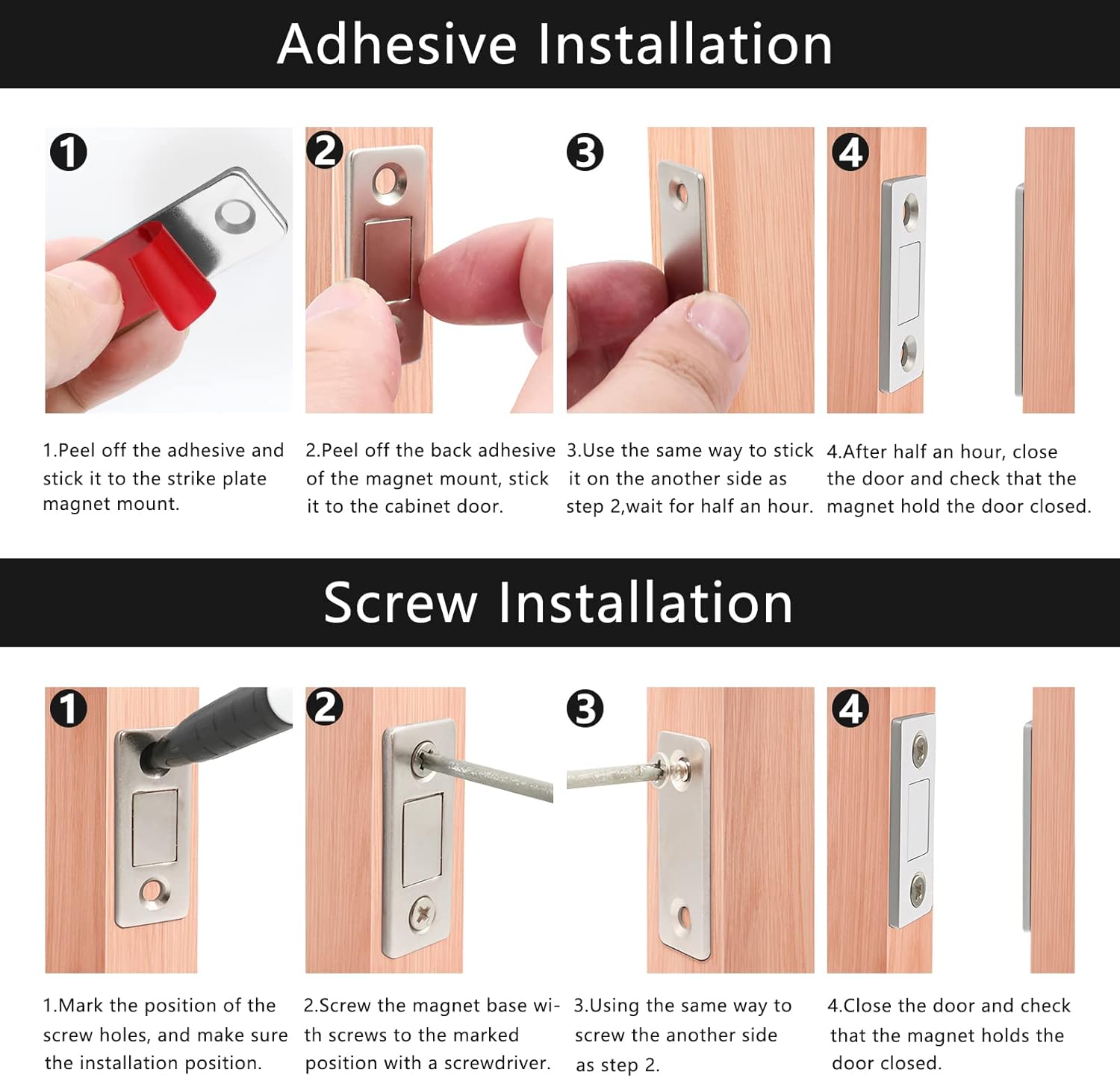 - Easy to Install: There are two ways to install: using strong adhesive sticker or screws mounting, which are both easy to install for you and keep the cabinet or door to stay shut without damage. You can choose the way according to what you want