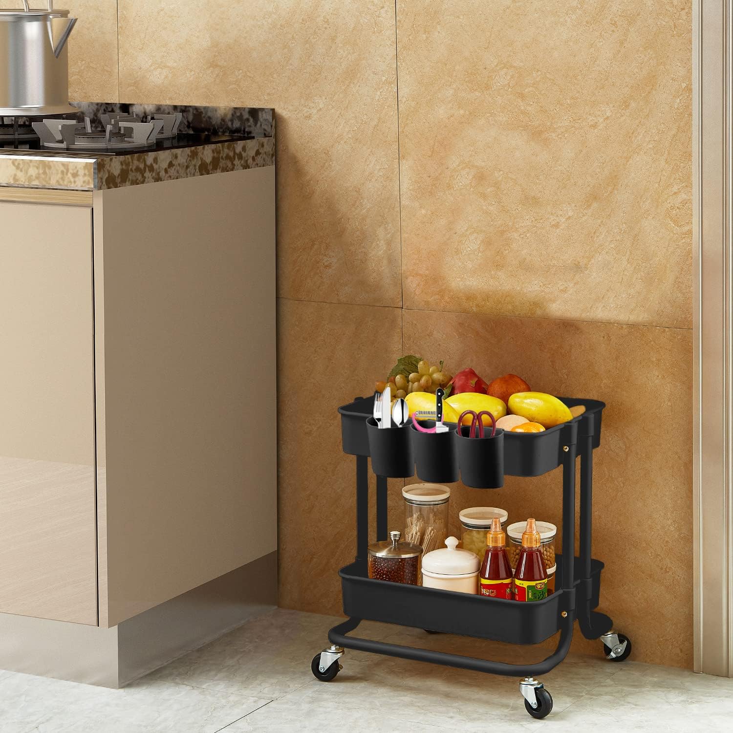 - 👍【Multifunctional Storage】-- This 2 tier rolling storage cart has multiple functions which can be used anywhere you want it to be such as office, bathroom, kitchen, art studio, salon, garden, garages, laundry rooms hobby and craft areas and so on. It can be used as a tools cart, organization rack, sofa or bed side end table, nightstand, book cart, bedroom/living room storage cart and so on.