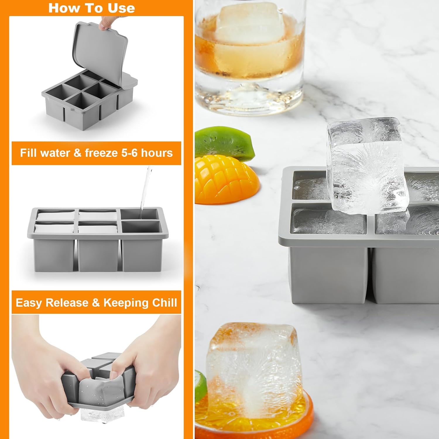 - 3 Pack Large Ice Cube Tray With Lid: Comes with set of 3, 6 giant ice cubes per ice mold, 2 inch large per ice cube and shapes square; Perfect to chill cocktails, whiskey, tequila, vodka or other drinks with less dilution. You can also use these ice molds to freeze food in perfect portions, such as soup broth or sauce servings, recipes, baby food storage, meal prep, and portion controlled meals