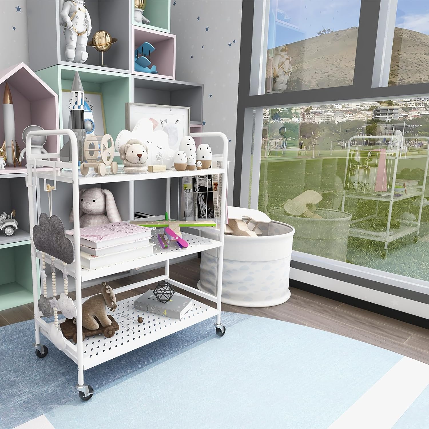 - 【Multi purpose】This trolley can be used in kitchens,bathrooms, children's rooms,offices, living rooms,bedrooms,and can be used as spice racks,bookcases,toy racks, flower racks,printer racks,etc.In particular,the hook and basket design makes it easier for you to place small items,newspapers and magazines,etc.This trolley makes your home and office more tidy and orderly.The powerful storage function brings you a comfortable experience.