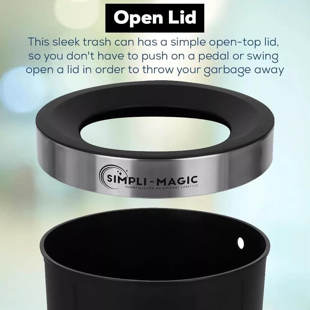 - No touch – The open top lid makes throwing away trash easier than ever. No more worrying about using a step pedal or a motion sensor.