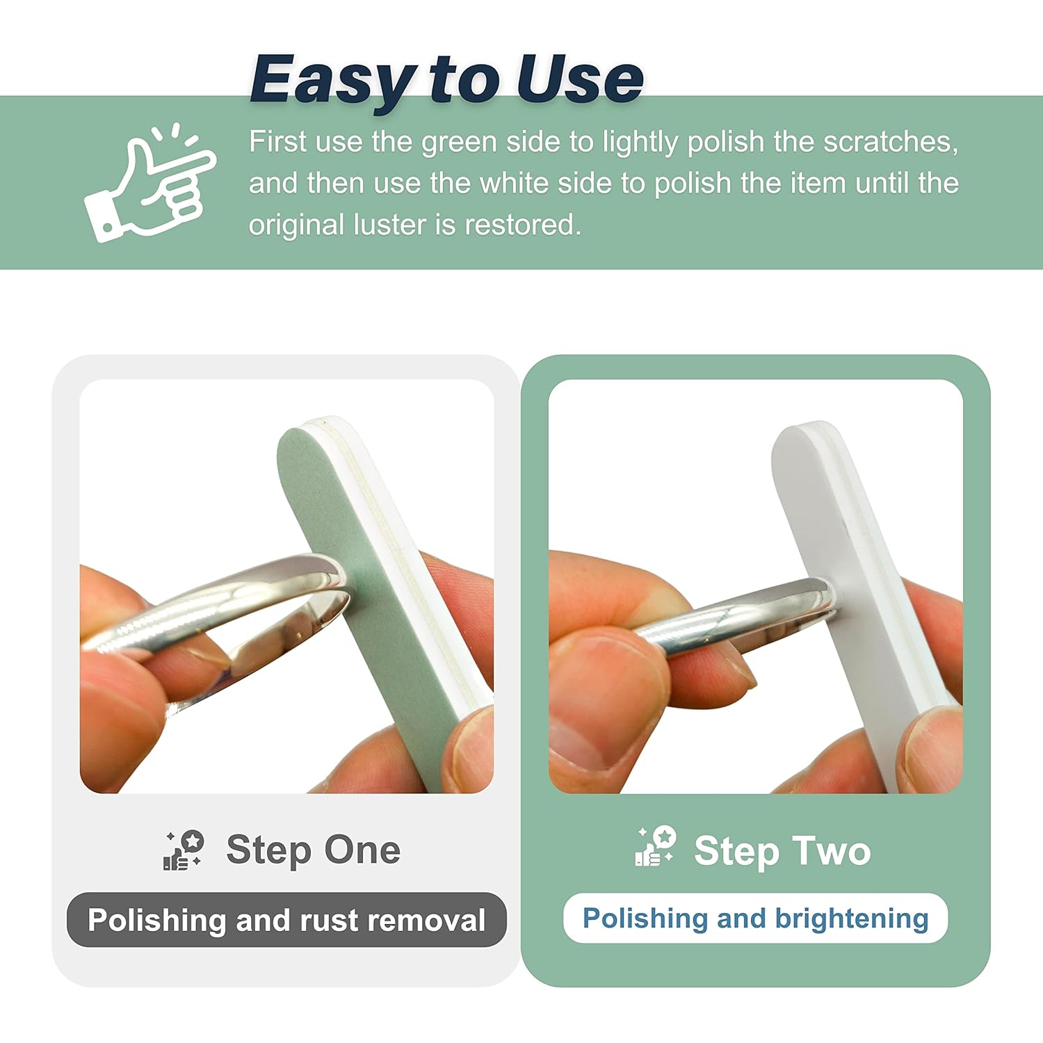 - 【EASY TO USE】 First use the green side to lightly polish the scratches, and then use the white side to polish the item until the original luster is restored.