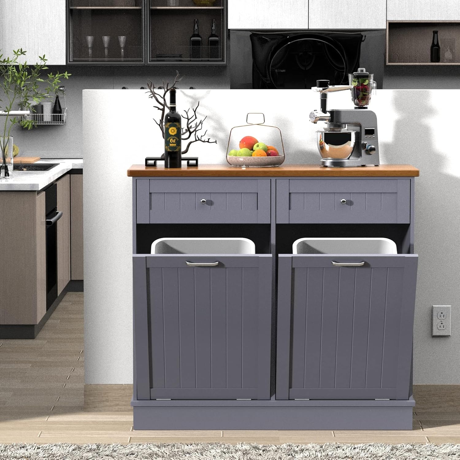 - 🏡【Kitchen Modern-style Trash Can】 The cabinets are simple and practical in design, perfect for dressing up your kitchen, home, apartment, dorm room, laundry room, etc. Combined with 2 pull-out drawers, you can store kitchen supplies, pet food, and the slanted drawer below can even be used as a laundry cabinet