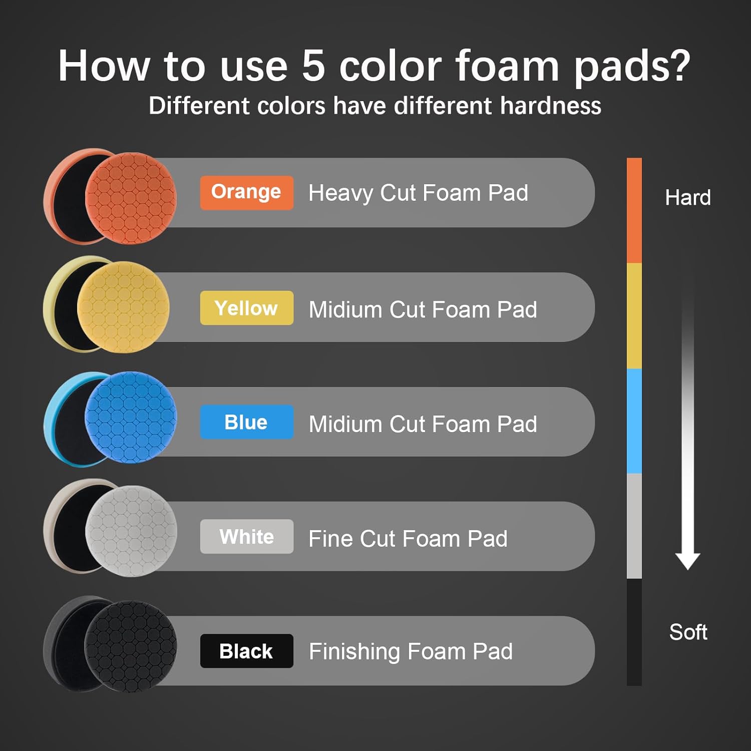 - 【Usage Steps】 Five colors represent five kinds of roughness. Hardness: orange>yellow>blue>white>black, you can choose polishing according to your needs. Orange polishing pads for rough polishing, blue and yellow for medium polishing, white for fine polishing, and black for finish polishing and waxing