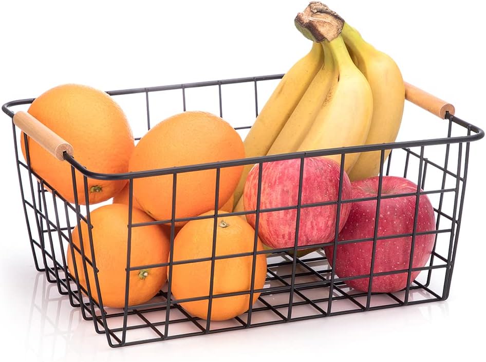 Metal Wire Food Storage Basket Organizer with Wooden Handles for Organizing Kitchen Cabinets, 4 Packs-Black