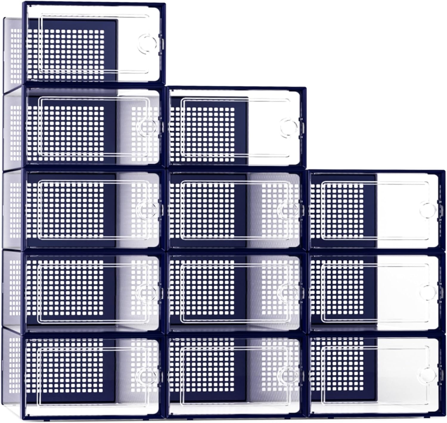 Kuject X-Large Shoe Storage Boxes Organizers Clear Plastic Stackable 12 Pack, Shoe Rack & Holder Substitute, Sneaker Containers, Toy Storage Organizer Bins for Entryway, Closet, Under Bed, Blue
