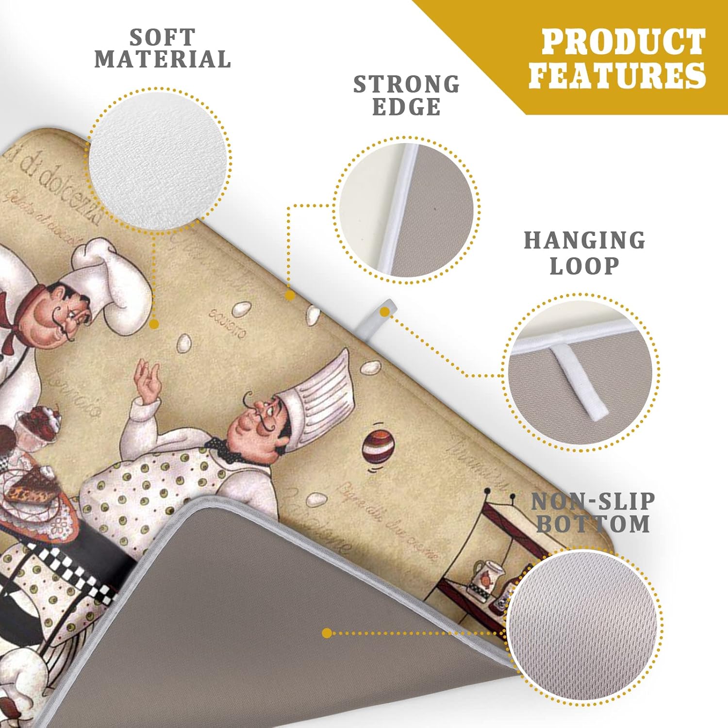 - Dish drying mat size: 18x24 inches, high quality polyester fat chef dish drying mat. Made of microfiber,super absorbent and fast drying dish drying mat. Absorbent microfiber, in a 3-layer design without sacrificing its softness. Both sides can be used, one with a Chef Kitchen pattern, the other with a gray non-slip bottom.Chef drying Mat for Coffee Bar Countertops fits most countertops while providing a smart, sharp look.