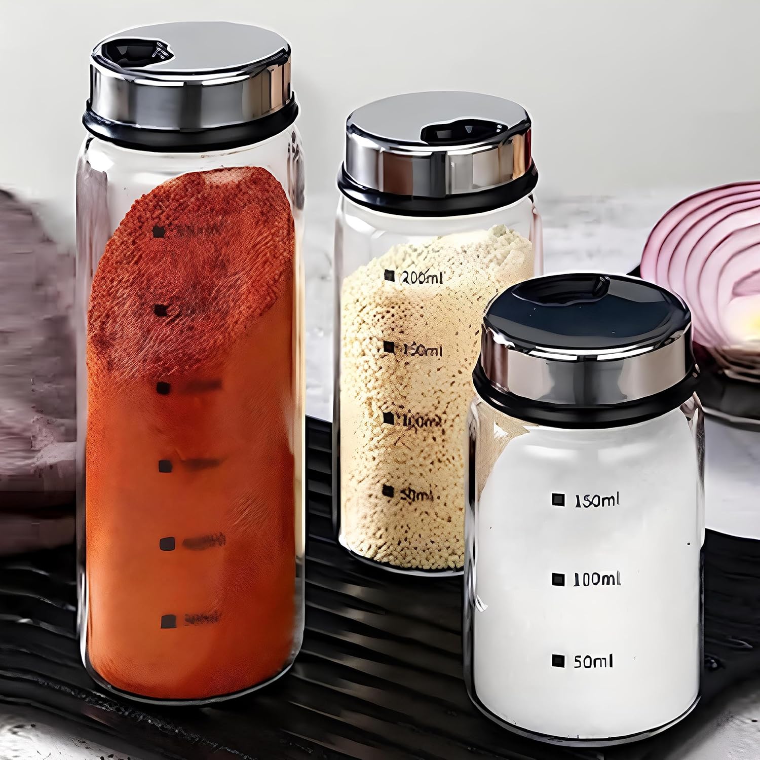 - 【SMOOTH & SECURE】The glass seasoning jar is resistant to acid and alkali, and it is easy for various seasonings to not react chemically with it. The concave anti-skid bottom makes it stand stably without falling.
