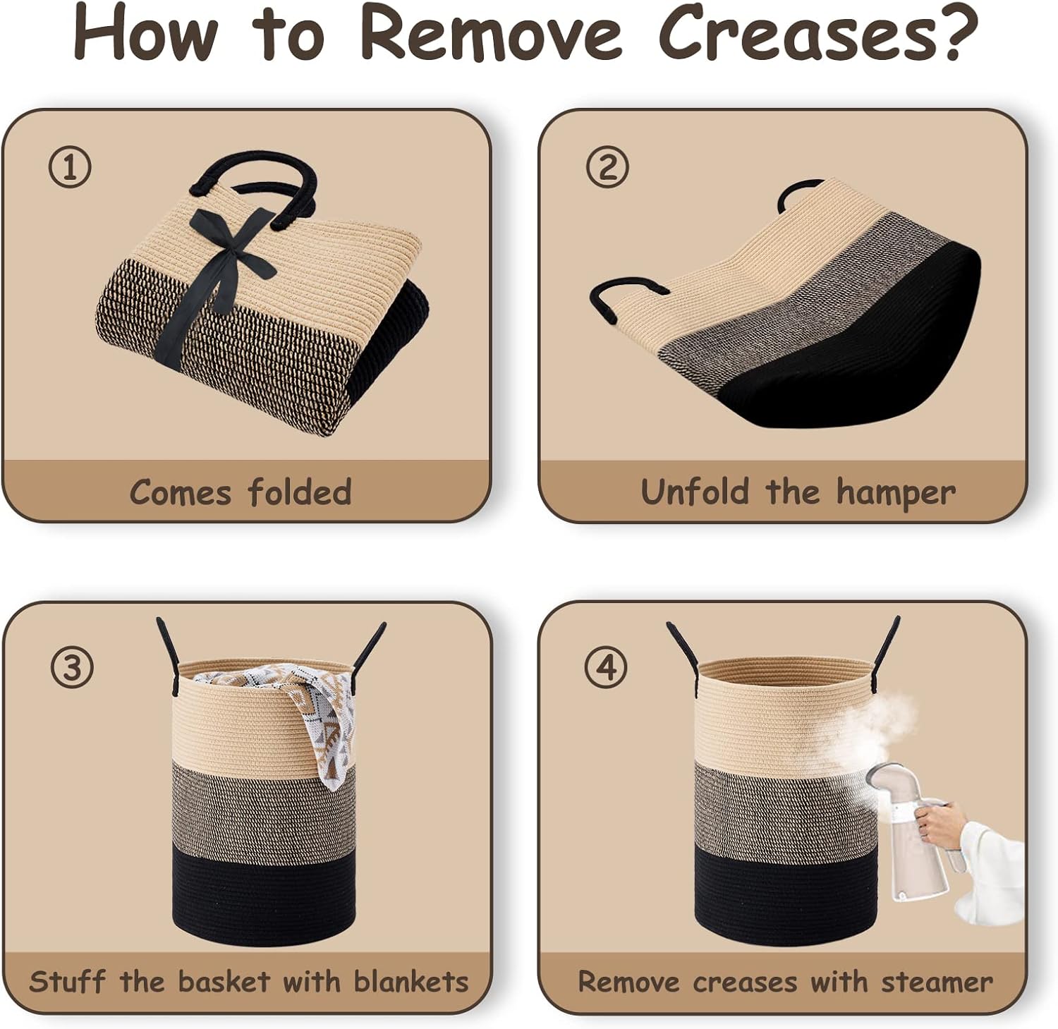 - ❤【Restore Elegant Shape】 To improve shipping efficiency, foldable woven rope hampers are packed compactly. You can put some blankets or small quilts in it and give it some time to regain its shape. Iron is a great idea to remove the creases.