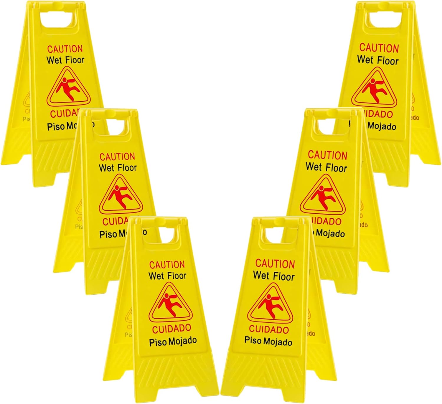 - ✔️6-PACK WET FLOOR SIGNS: The bright yellow wet floor sign with a falling person icon is perfectly crafted out of durable material to provide long-lasting strength.