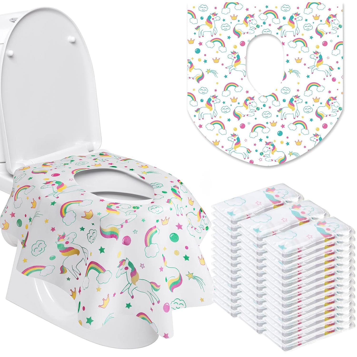 - What You Get: you will receive 50 unicorn themed disposable toilet seat covers; The quantity is sufficient, and the packaging is small, it will not take up too much space at home or on a trip, suitable for travel, going out, toilet training
