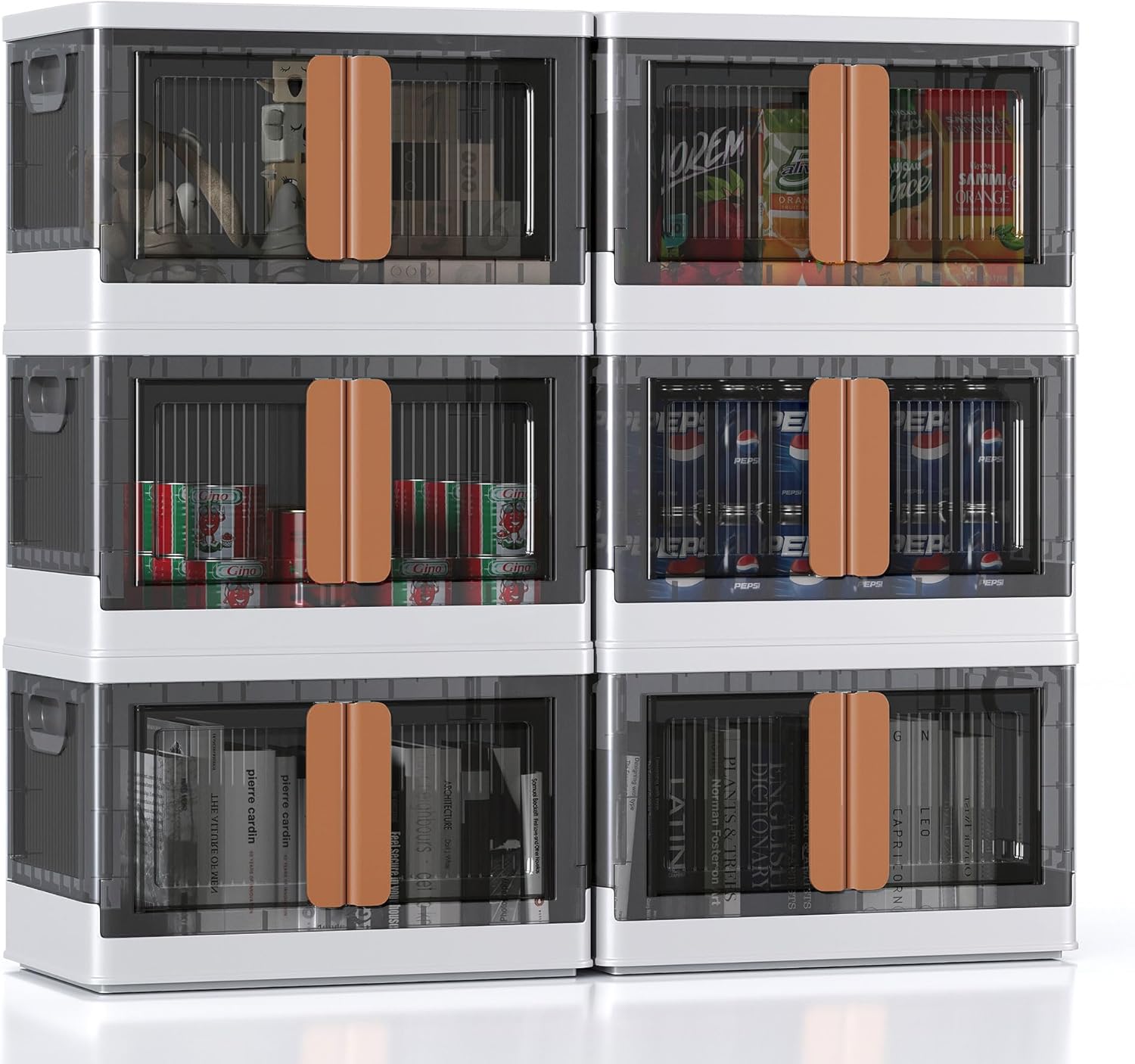 8.4Gal Collapsible Storage Bins with Lids & Wheels - 6 Pack Stackable with Doors, Heavy-Duty Plastic Containers for Home/Office, White