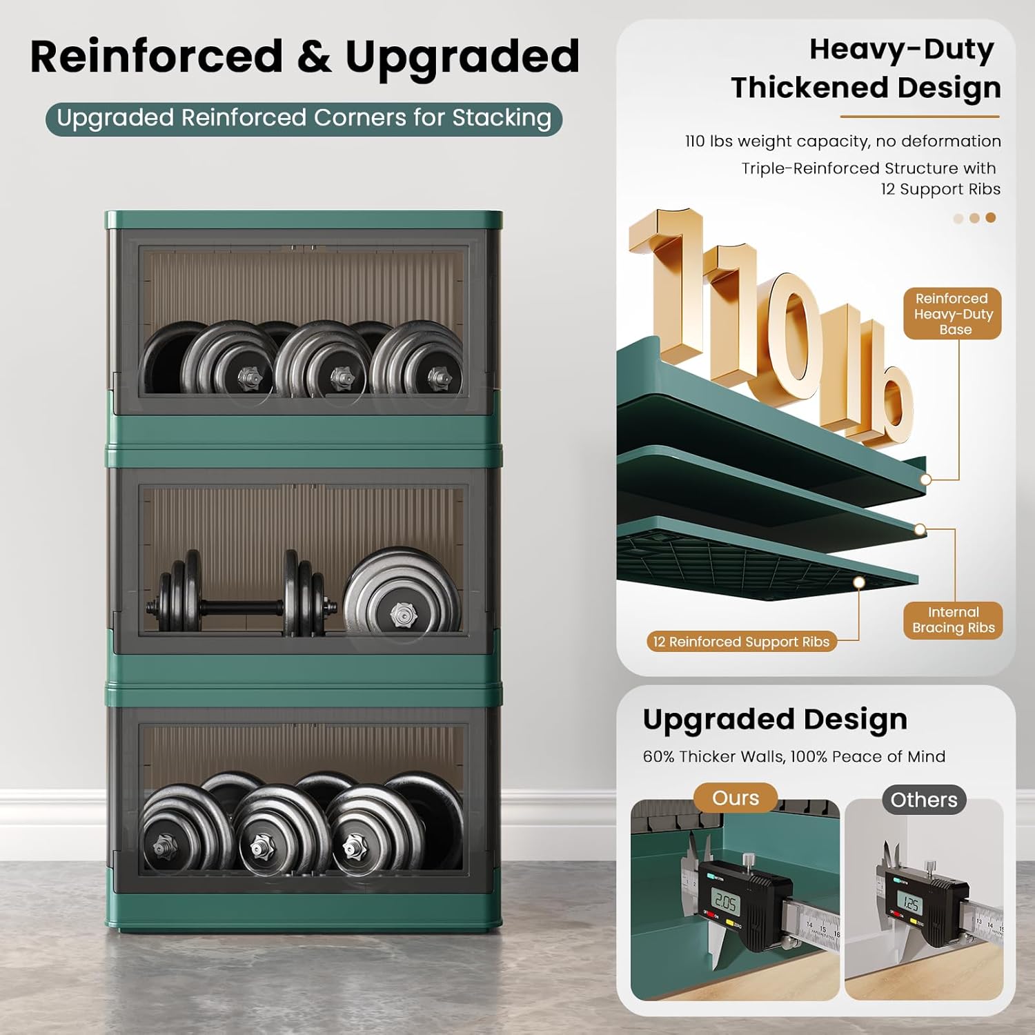 8.4Gal Collapsible Storage Bins with Lids & Wheels - 6 Pack Stackable with Doors, Heavy-Duty Plastic Containers for Home/Office, Green