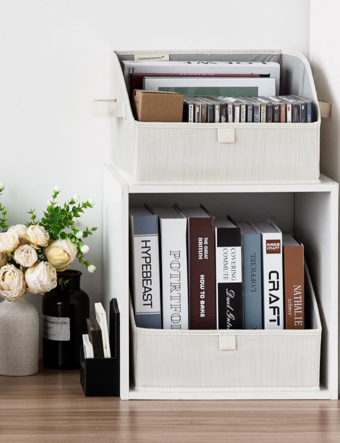 - The bottom board is sewn to the side of the shelf bin, making it easy to assemble and easily collapsible when not in use.