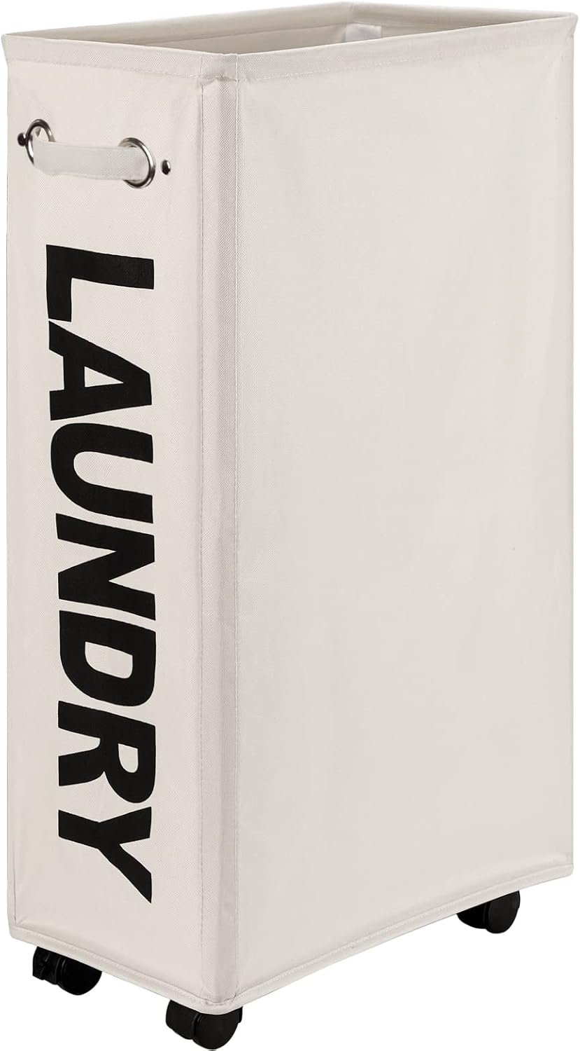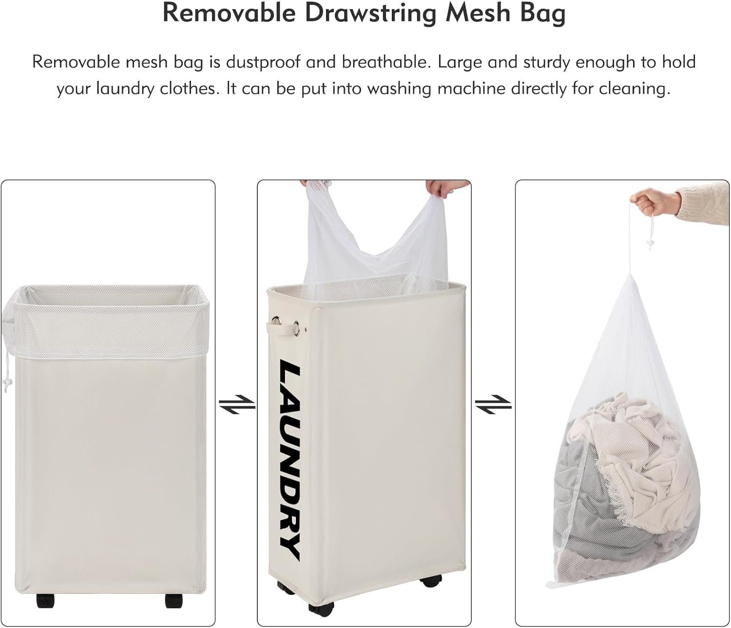 DOKEHOM 29-Inches Enlarged Slim Laundry Basket with Removable Wash Bag on Wheels, Collapsible Rolling Laundry Hamper, Foldable Narrow Corner Clothes Storage Bins (Beige)