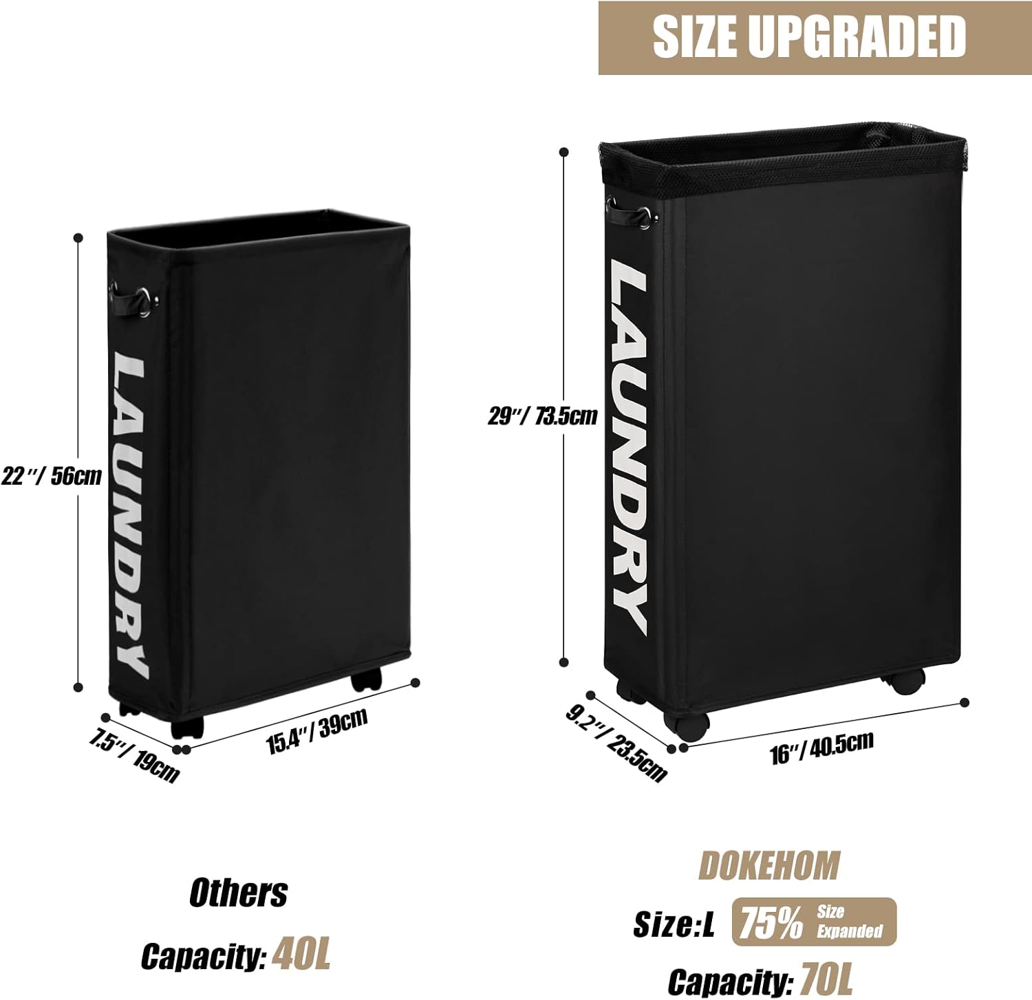 - ENLARGE SLIM SIZE - 16"(L) x 9"(W) x 29"(H) / 40.5 x 23.5 x 73.5CM with 70L capacity is fit into narrow space, you can folded it and put into drawer or under bed when you don't use it