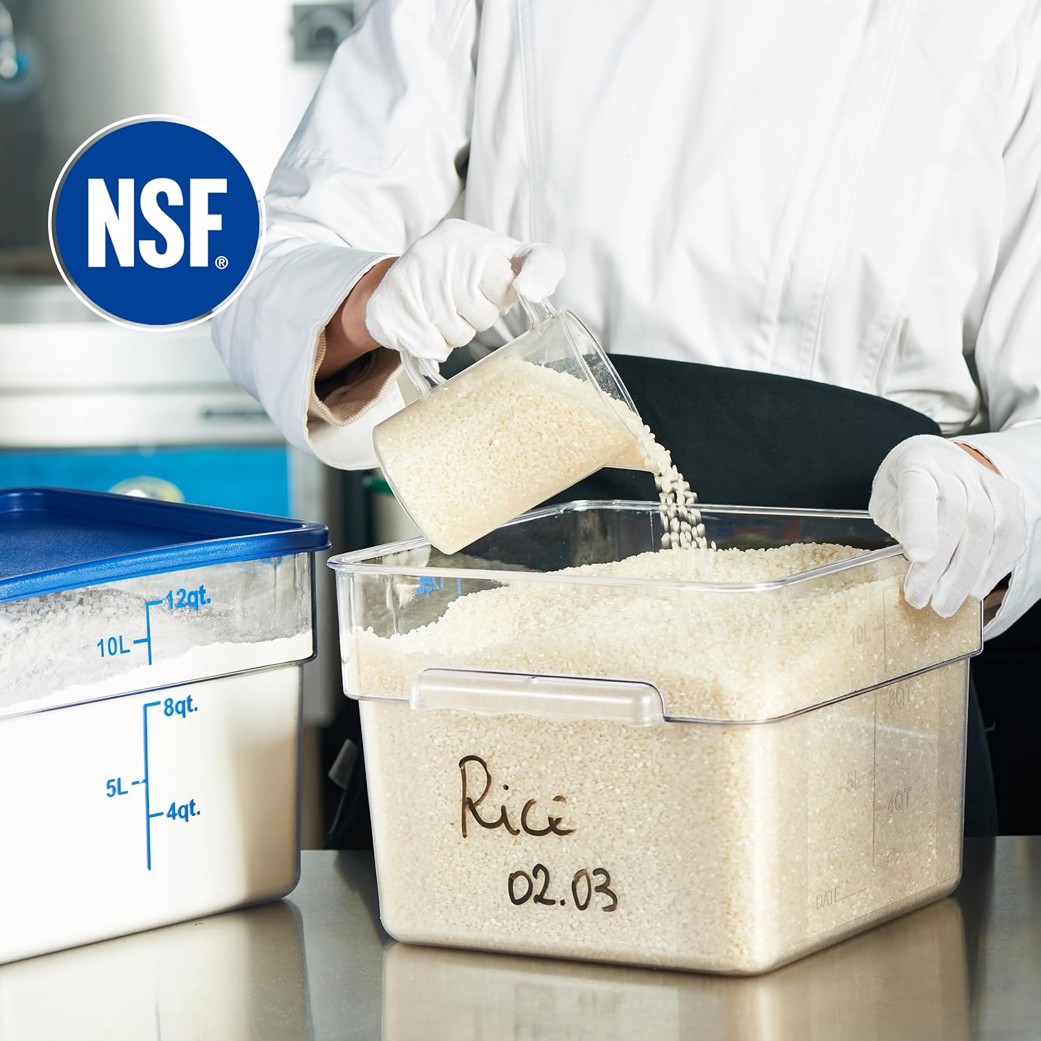 - NSF Listed Commercial Grade - This food storage container sets are certified by the NSF to meet strict commercial standards for safety and quality. Large capacity (12 quarts )provide ample space for storing large quantities of food, making them a great choice for use in professional kitchens or for anyone who values high-quality food storage containers.
