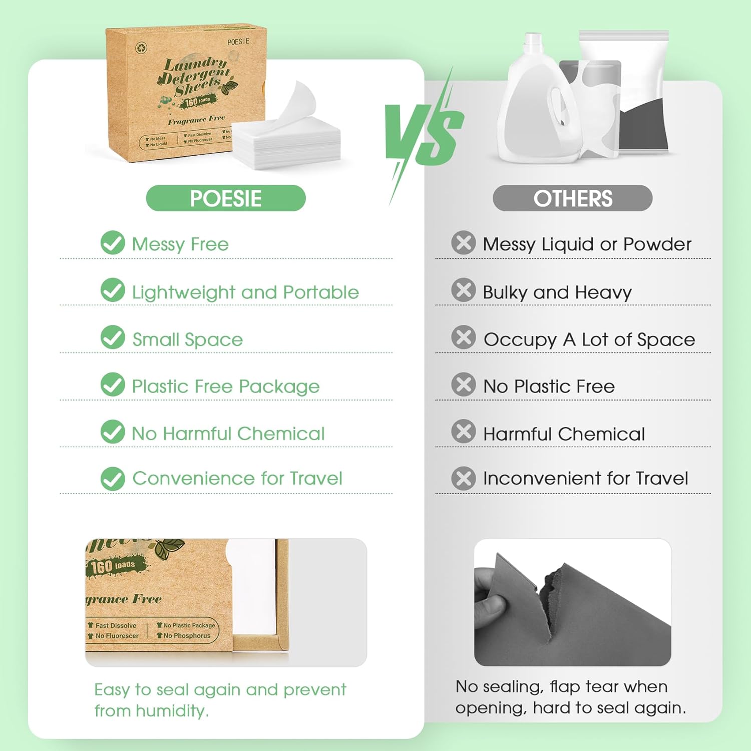 Poesie Laundry Detergent Sheets 3 Pack 480 Count 240 Loads Laundry Detergent for Travel Home Save Space Portable Laundry Strips Hypoallergenic Concentrated Soap Sheets Washing HE Fragrance Free