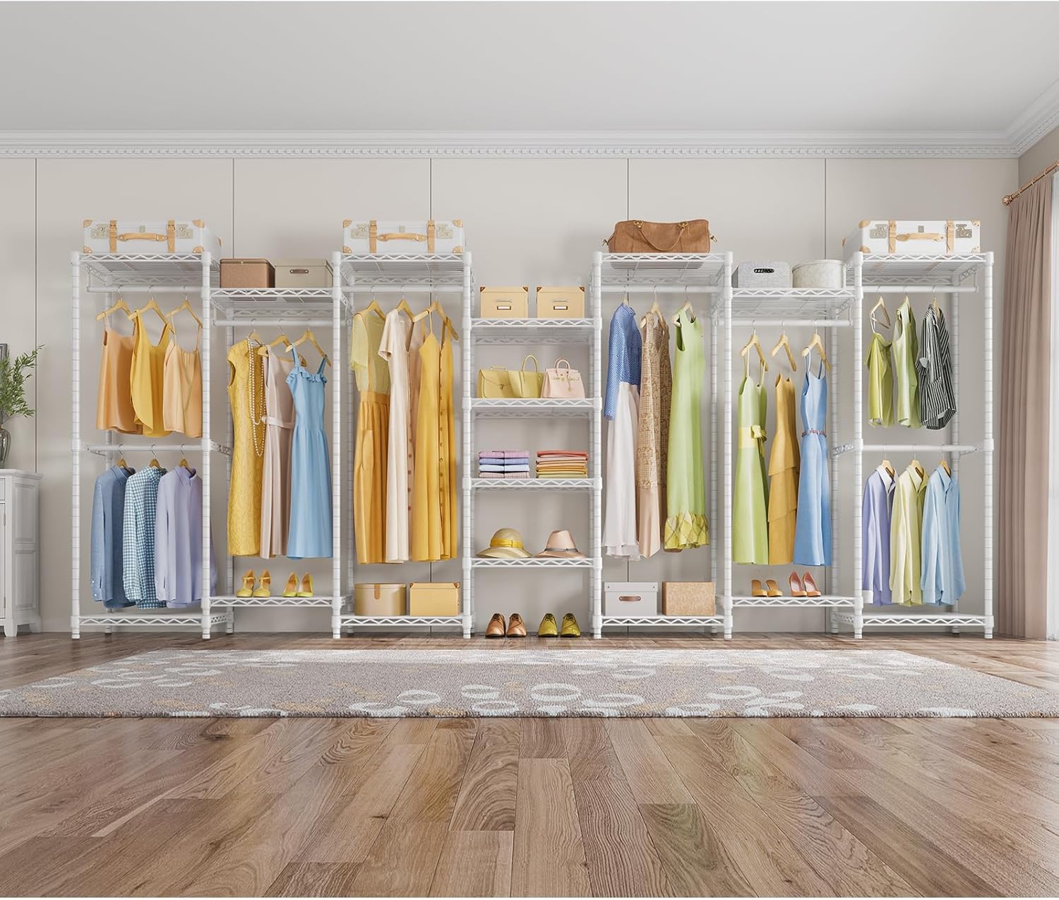 - Multifunction Closet Rack: 6 Tiers Closet Rack maximize the storage area, ensure you enough space to place your clothes, accessories, bedding, lining, shoes, etc. The 4 pcs clothes hanging rods hold up to 60 lbs for each, it is great for hanging suits, coats, long dresses, jackets, pants, shirts or other heavy clothes.