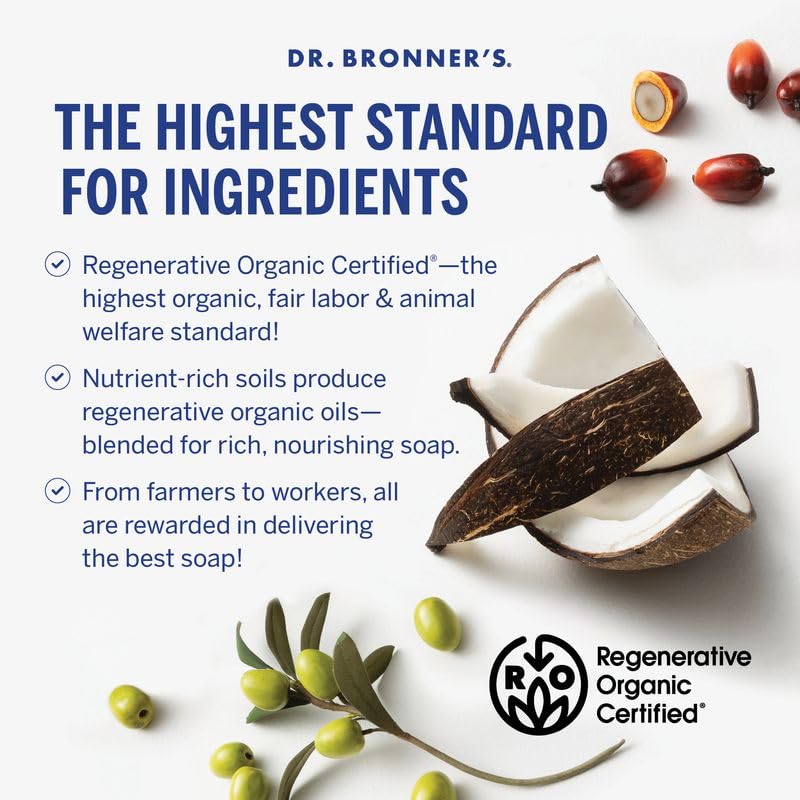 - MADE WITH ORGANIC OILS & CERTIFIED FAIR TRADE INGREDIENTS: Dr. Bronner's Unscented Liquid Soap Refills are made with over 70% certified organic & fair trade ingredients, promoting healthy communities, ethical working conditions & fair prices. And now sourcing Regenerative Organic Certified coconut, palm kernel, and olive oil
