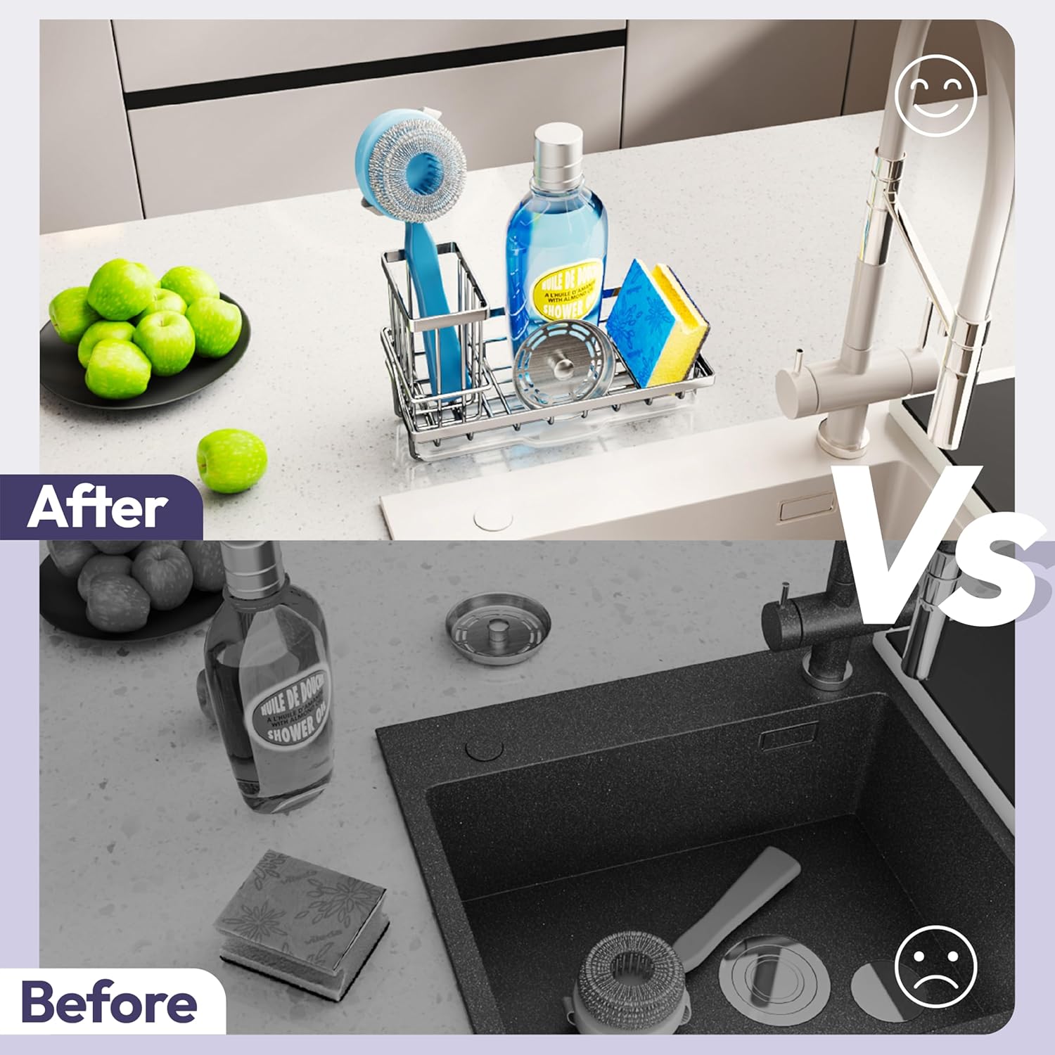 - [Anti-slip Silicone Pad & Stable Base]: The dish sponge holder comes with specially designed anti-slip silicone pads, which prevents the kitchen sink caddy base from sliding or wobbling, and also protects the kitchen countertop from unsightly scratches