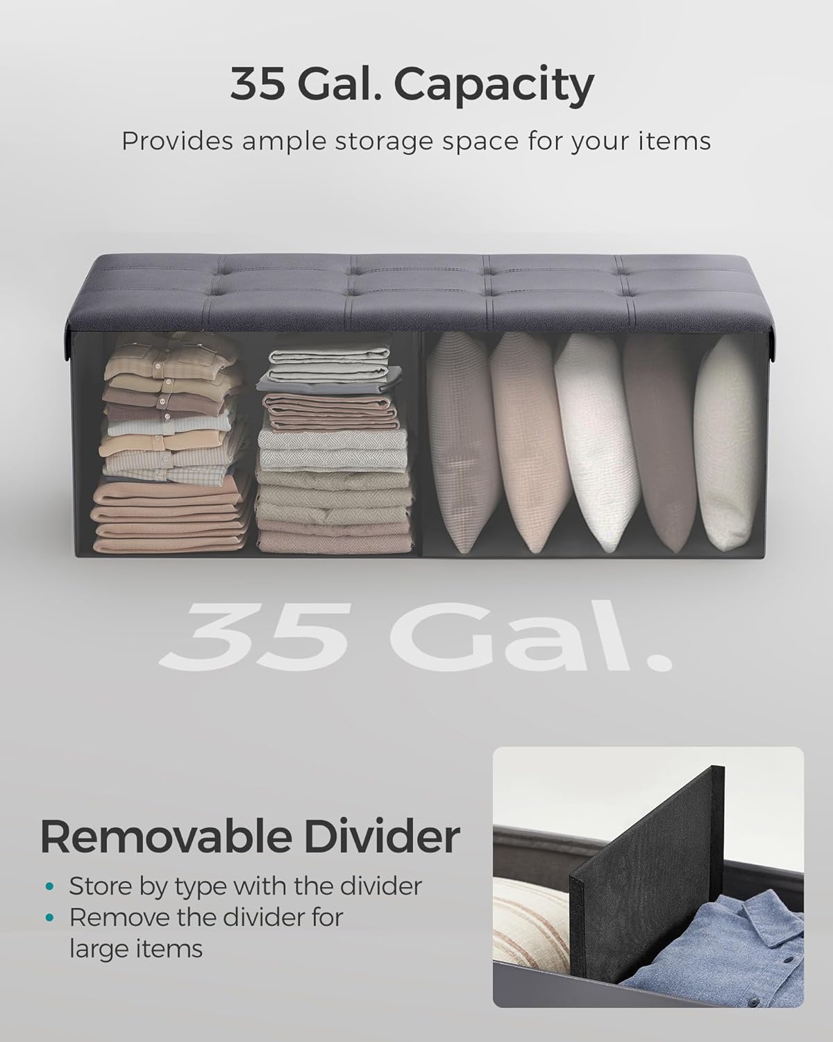 - 【OODLES OF STORAGE】Unfold this storage box, insert the sturdy base plate, and you have 35 gal. (131 L) space for storing bed linen, books, or clothing