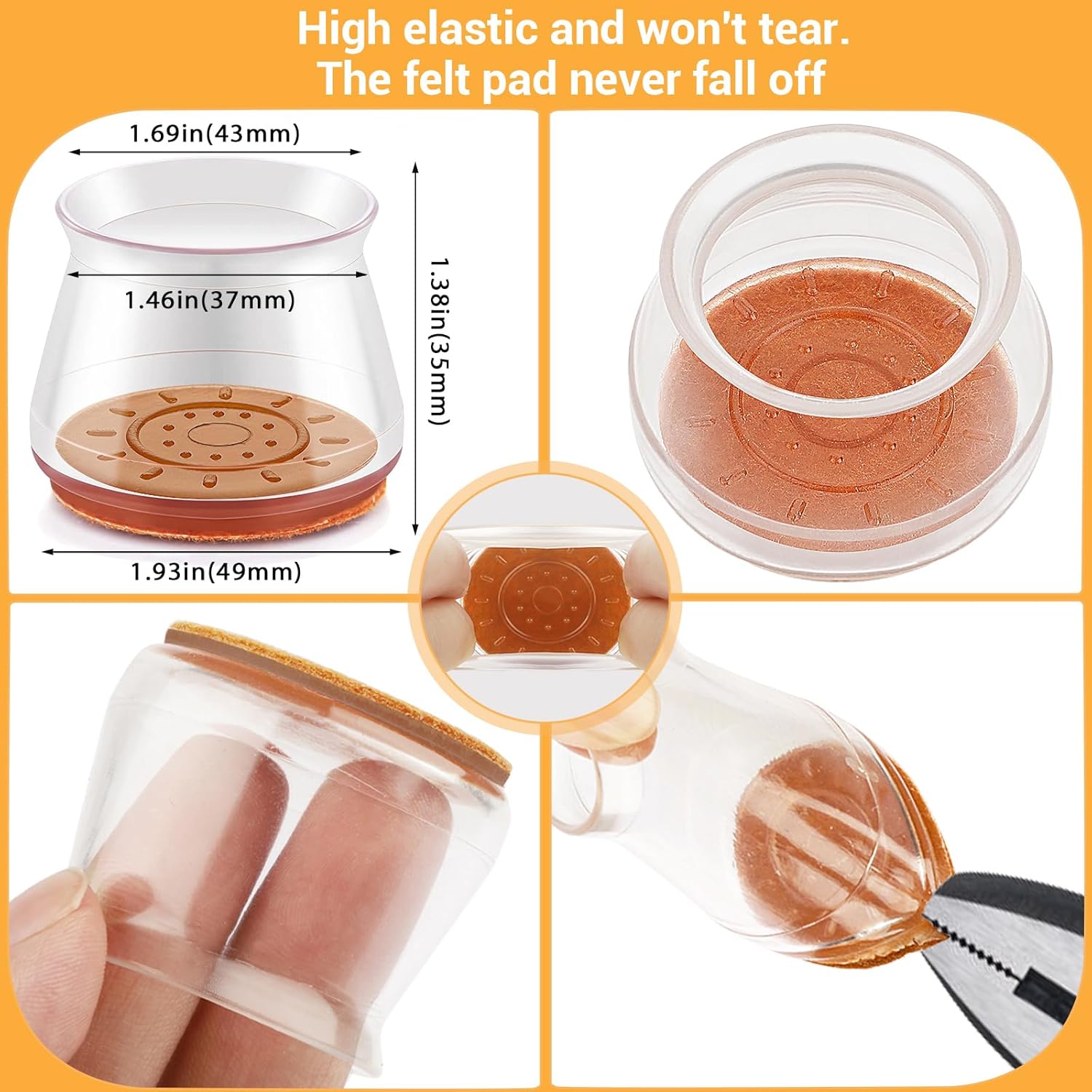 - 【The Felt Pad Never Fall Off】: Latest upgrade! Our chair leg protectors for hardwood floors do not use gel. The bottom felt pad and the silicone chair leg floor protectors are integrated with a high-pressure machine to ensure that they will never fall off. Ordinary felt furniture pads use gel, which is not strong enough, the felt pads are easily sliding off and stain your floor.