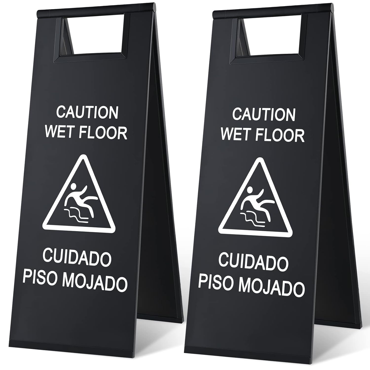 Kigley 2 Pcs Wet Floor Sign, 24 Inch Stainless Steel Caution Wet Floor Sign Double Sided Portable Foldable Bilingual Safety Warning for Hotel Market Restroom Restaurant Office (Black)