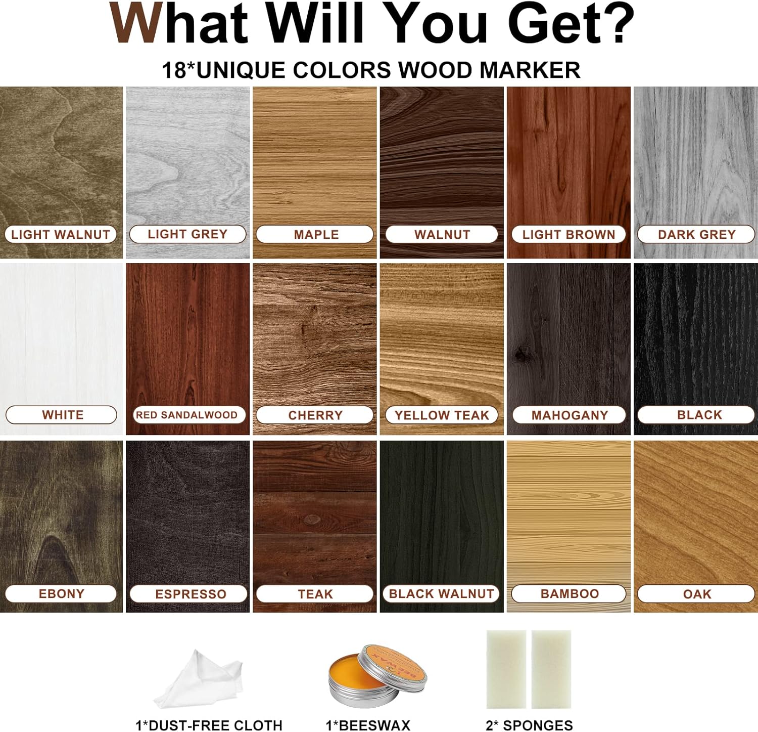 - New Upgraded Wood Marker Touch-Up Kit: This wood repair kit includes 18 colors of wood markers and 50 ml/1.7fl.oz of beeswax. The new wood repair combination kit lets you give new life to old faded wood finishes in your home as you restore scratches, stains, and fading on wood floors and furniture while using the included beeswax to clean and polish the furniture