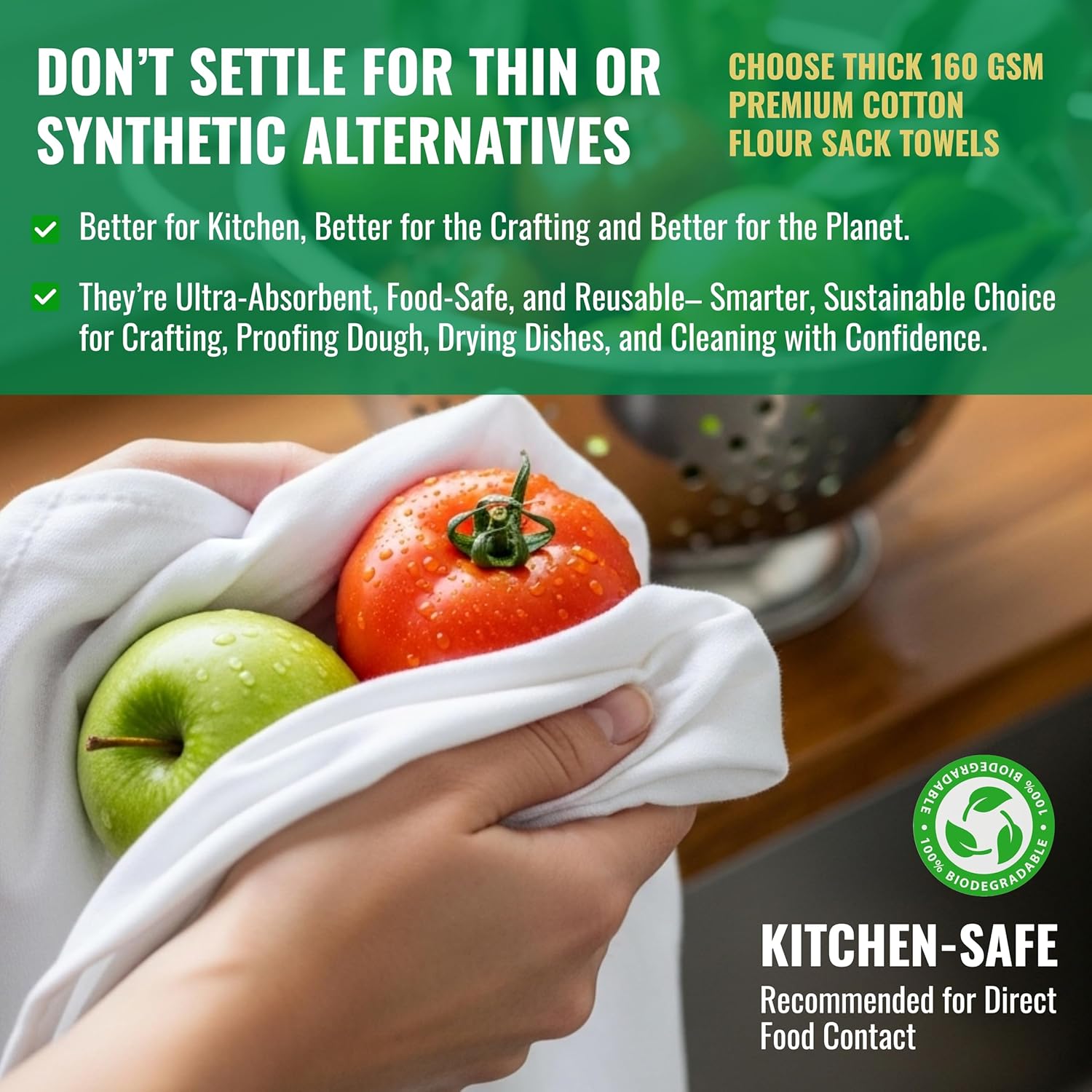 - ✅ 100% Natural Cotton – Safe for Food and Family Use Crafted from unbleached, chemical-free premium cotton, these lint-free towels are perfect for food preparation, and eco-conscious living. An ideal choice for anyone looking for “premium dish towels” or “eco-friendly flour sack towels.”