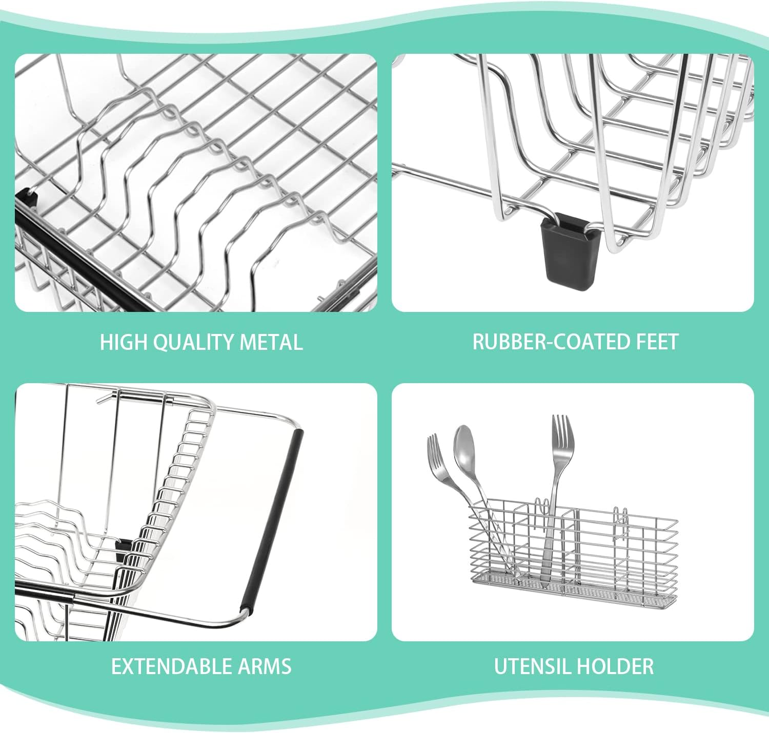- Non-slip: extendable rubber arms keep the rack from sliding into the sink, and four rubber-coated feet protect the countertop and sink from scratches.