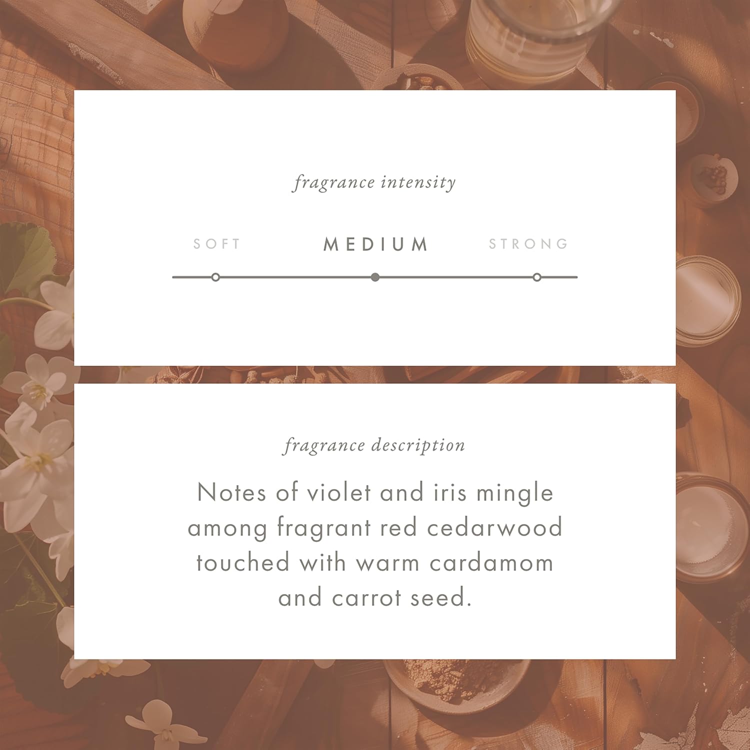 - THE FRAGRANCE: Santal & Red Cedar features notes of violet and iris mingle among fragrant red cedarwood touched with warm cardamom and carrot seed.
