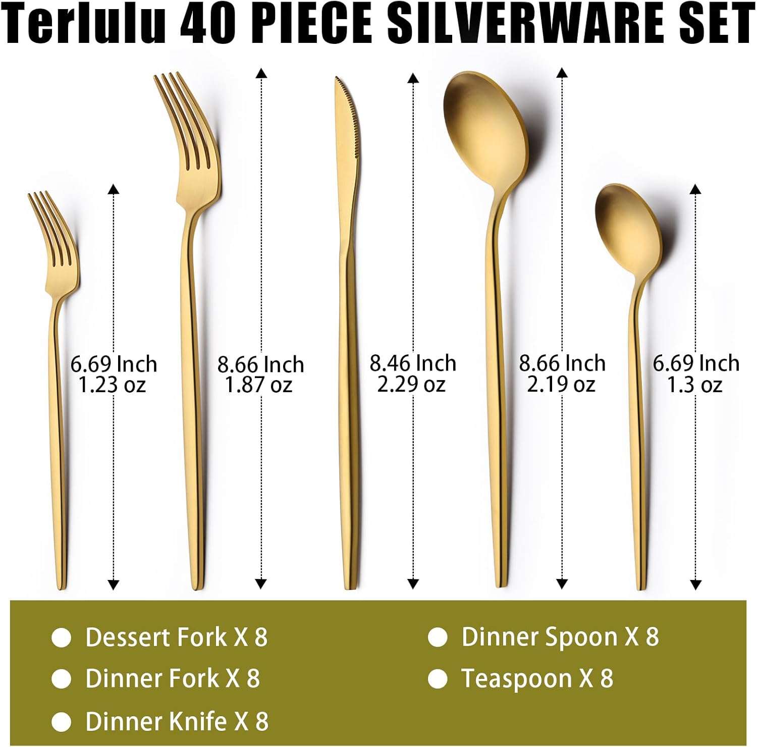 - 【SERVICE FOR 8】 Terlulu 40 piece gold silverware set for 8 includes 8 dinner forks, 8 dinner spoons, 8 dinner knives, 8 teaspoons, 8 salad/dessert forks in normal size, perfect for most families.