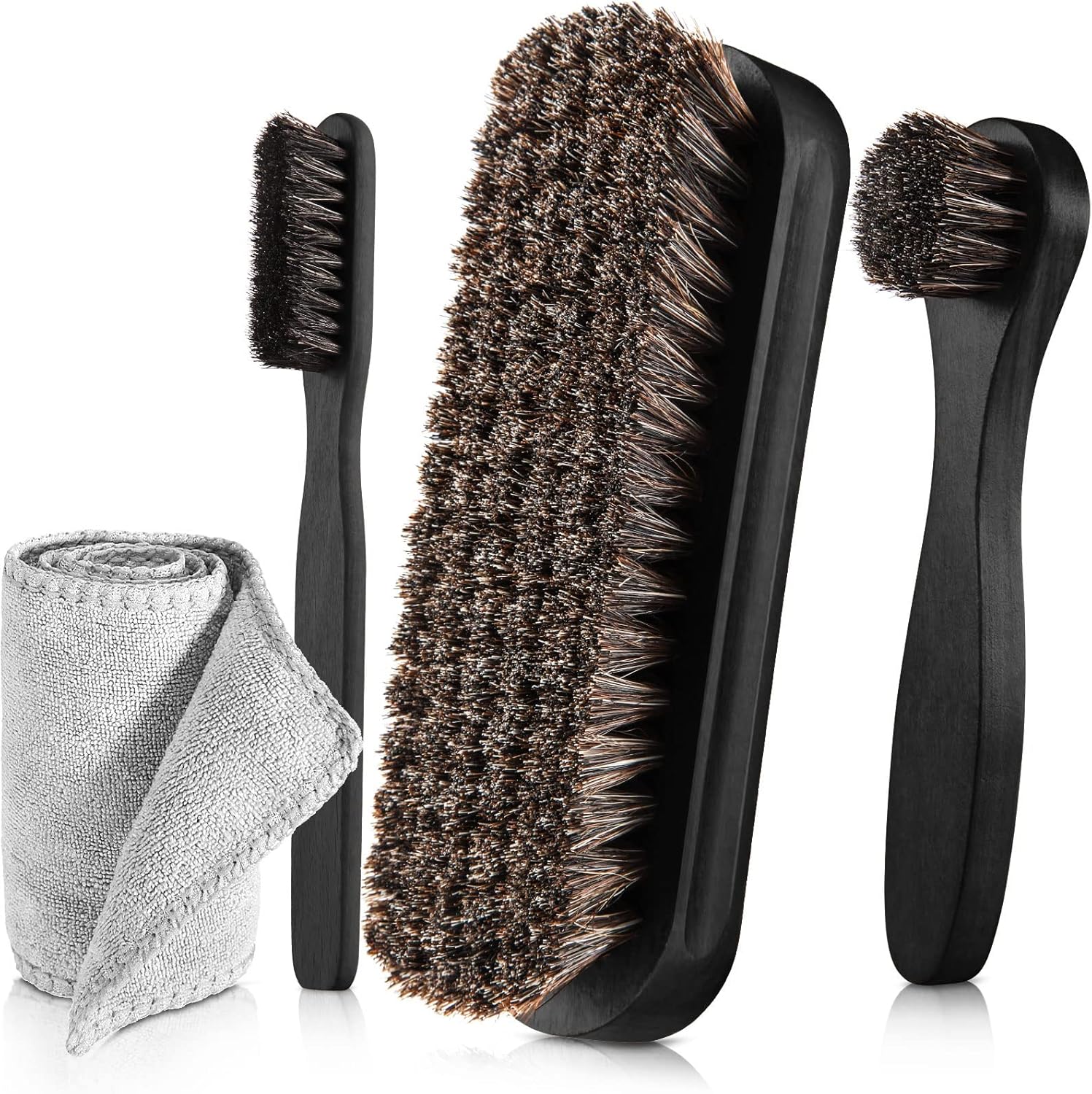 4 Pcs Horsehair Shine Shoes Brush Kit Polish Dauber Applicators Cleaning Leather Shoes Boots Care Brushes Suede Cleaner Brush with Microfiber Shoe Cloth(4 Pcs Black D)