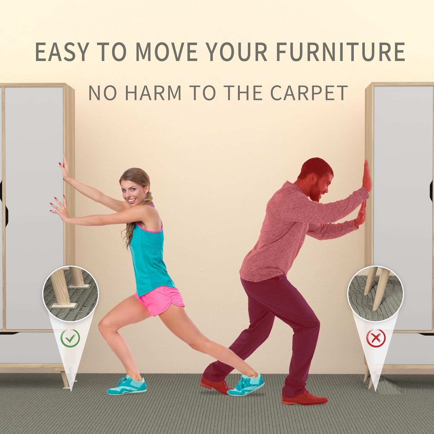 - FURNITURE MOVING PADS PROTECT ALL CARPET SURFACES - 8 pcs 4 3/4” beige square furniture sliders for carpet. Just put these rubber foam under the furniture feet to move it, no more scratches and noise here!