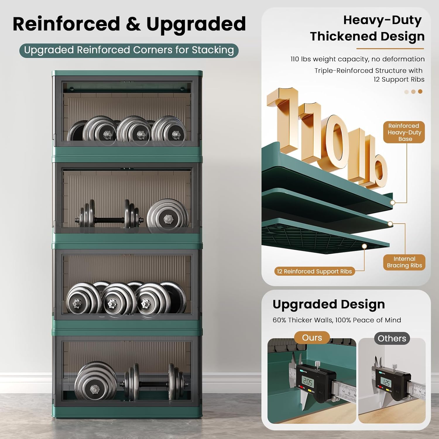 8.4Gal Collapsible Storage Bins with Lids & Wheels - 4 Pack Stackable with Doors, Heavy-Duty Plastic Containers for Home/Office, Green