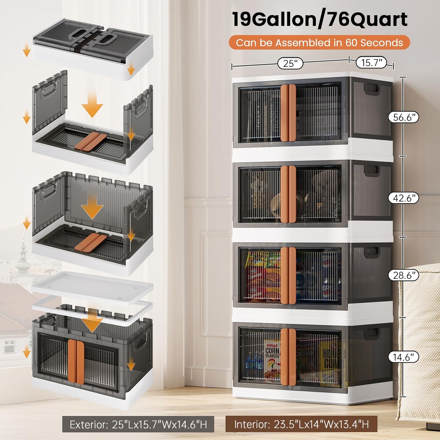 19Gal Collapsible Storage Bins with Lids & Wheels - 2 Pack Stackable with Doors, Heavy-Duty Plastic Containers for Home/Office, White