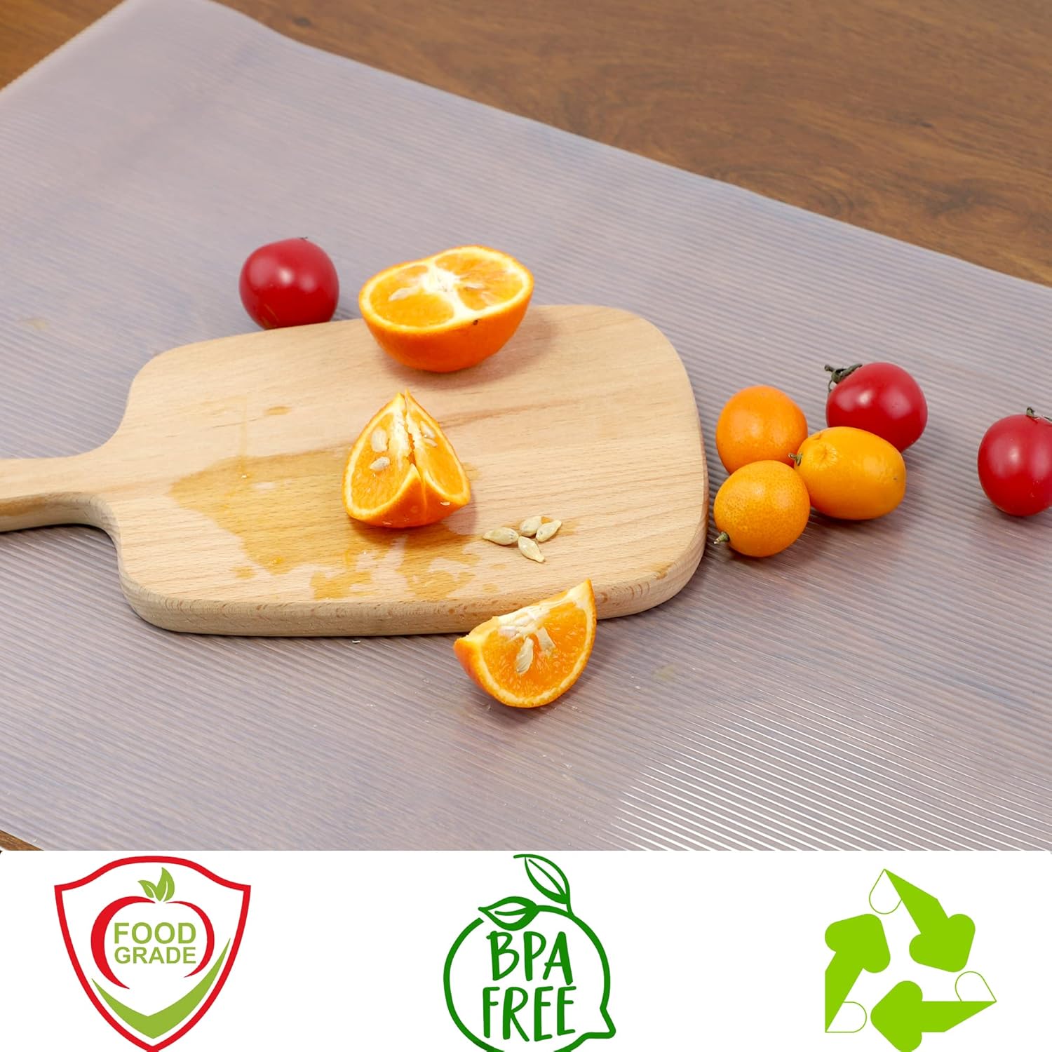 - ★ SAFE & PREMIUM QUALITY MATERIAL -The shelf liners are made of high quality food grade EVA material, BPA free and could be used to contact fruits and vegetables directly. The EVA material cabinet liner is sturdy and duarblity, could be last for a long time in life and resued.