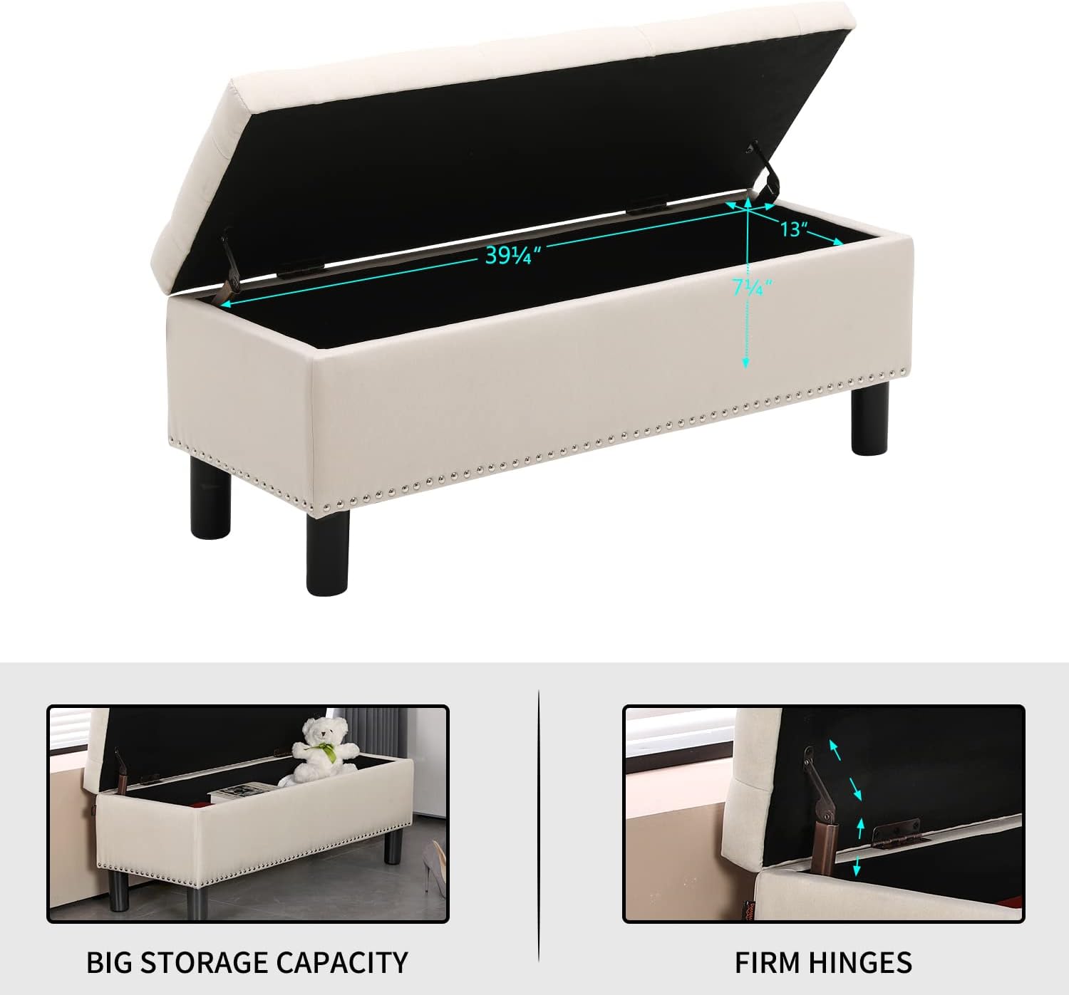 - Firm Hinges Construction : Crafted with firm hinges to support your daily flip for the durable usage. With premium linen-look fabric, this ottoman with storage for living room boasts long-lasting stability.
