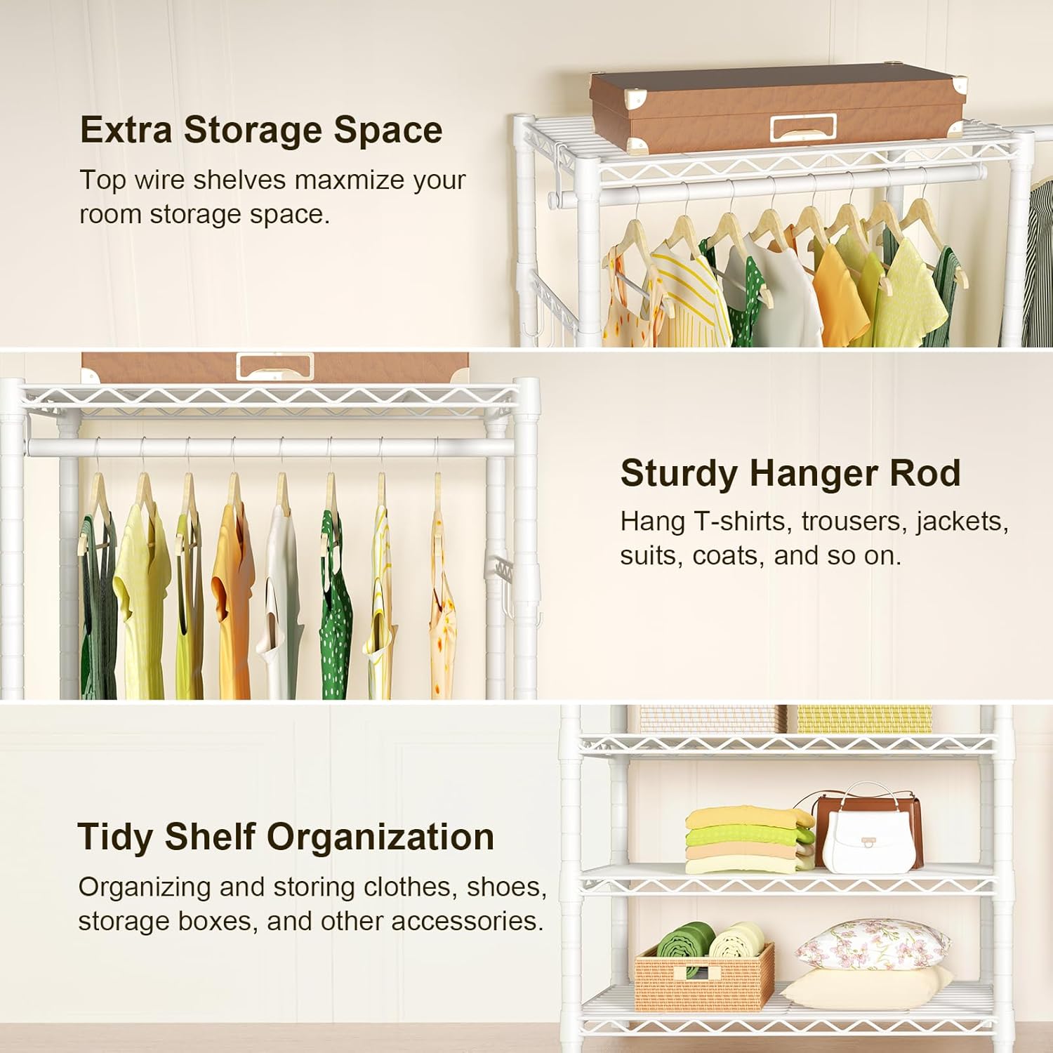 - [Multifunctional Design]: Use the shelves for folded clothes, the hanger rods for suits and dresses, and the hooks for hats, scarves, and bags