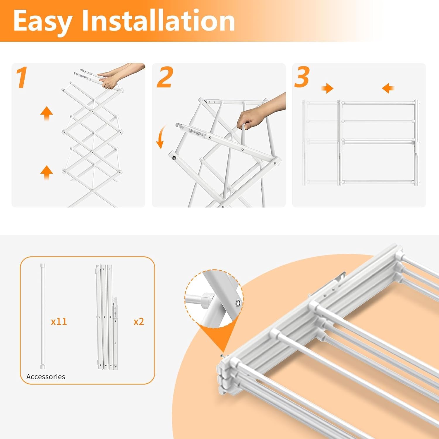 - 【Easy Assembly】With clear instructions, you can assemble this clothes drying rack in just 10 minutes, making it a convenient addition to your daily routine.