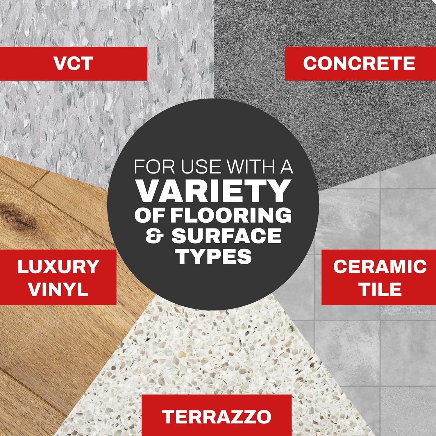 - Use on a variety of flooring surfaces like vinyl composite (VCT), luxury vinyl tile (LVT), vinyl asphalt, vinyl asbestos, sheet vinyl, rubber, linoleum, terrazzo, marble, granite, concrete, ceramic, sealed wood, natural stone, brick, slate and quarry tile