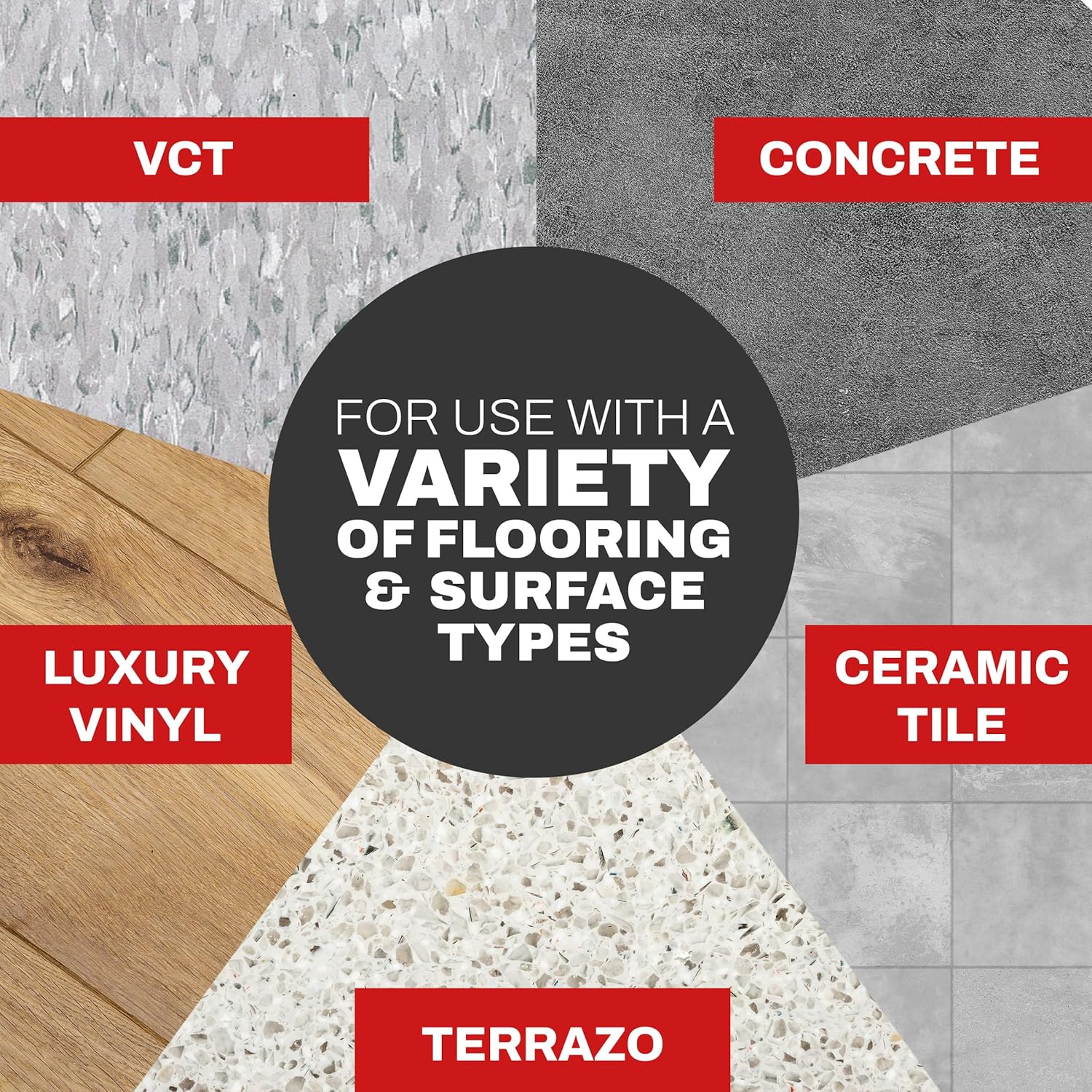 - For use on a variety of flooring types such as vinyl composite, vinyl asphalt, vinyl asbestos, 100% sheet vinyl, terrazzo, rubber, linoleum, marble, granite, concrete and sealed wood floors.